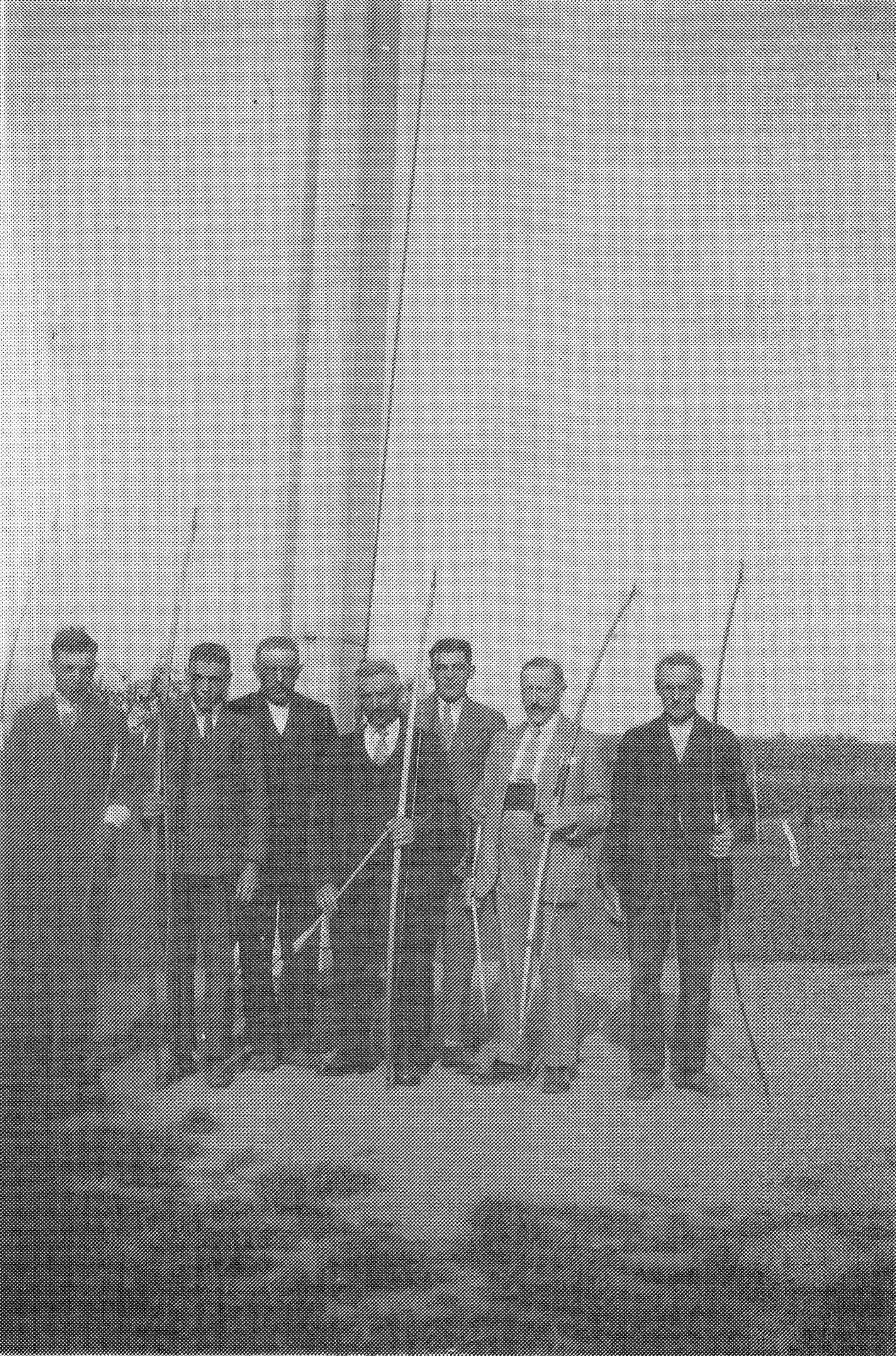 - BeschrijvingWipschieters aan de staande wip in Winge-Hoek, naast het voormalige café van Stenne. Van links naar rechts: Frans, Remie, Louis, ?, Jozef Vander Meeren, ?, ?