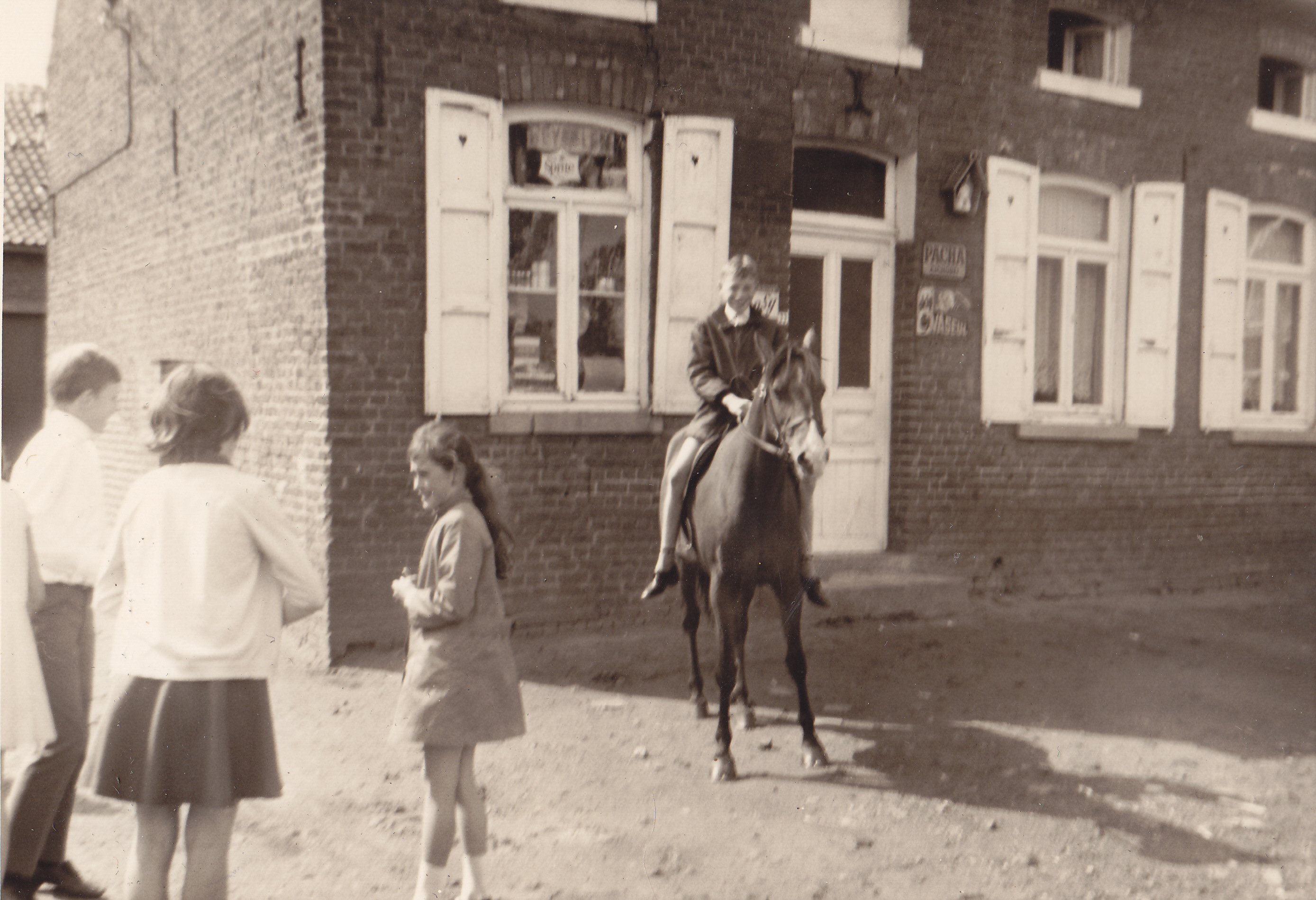 - BeschrijvingVoor de winkel van Anna Van Craenen; op het paard : Dirk Van Den Dries, Van links naar rechts : Evrard Van De Gaer, Magda Van Aerschot en Christine Nolmans