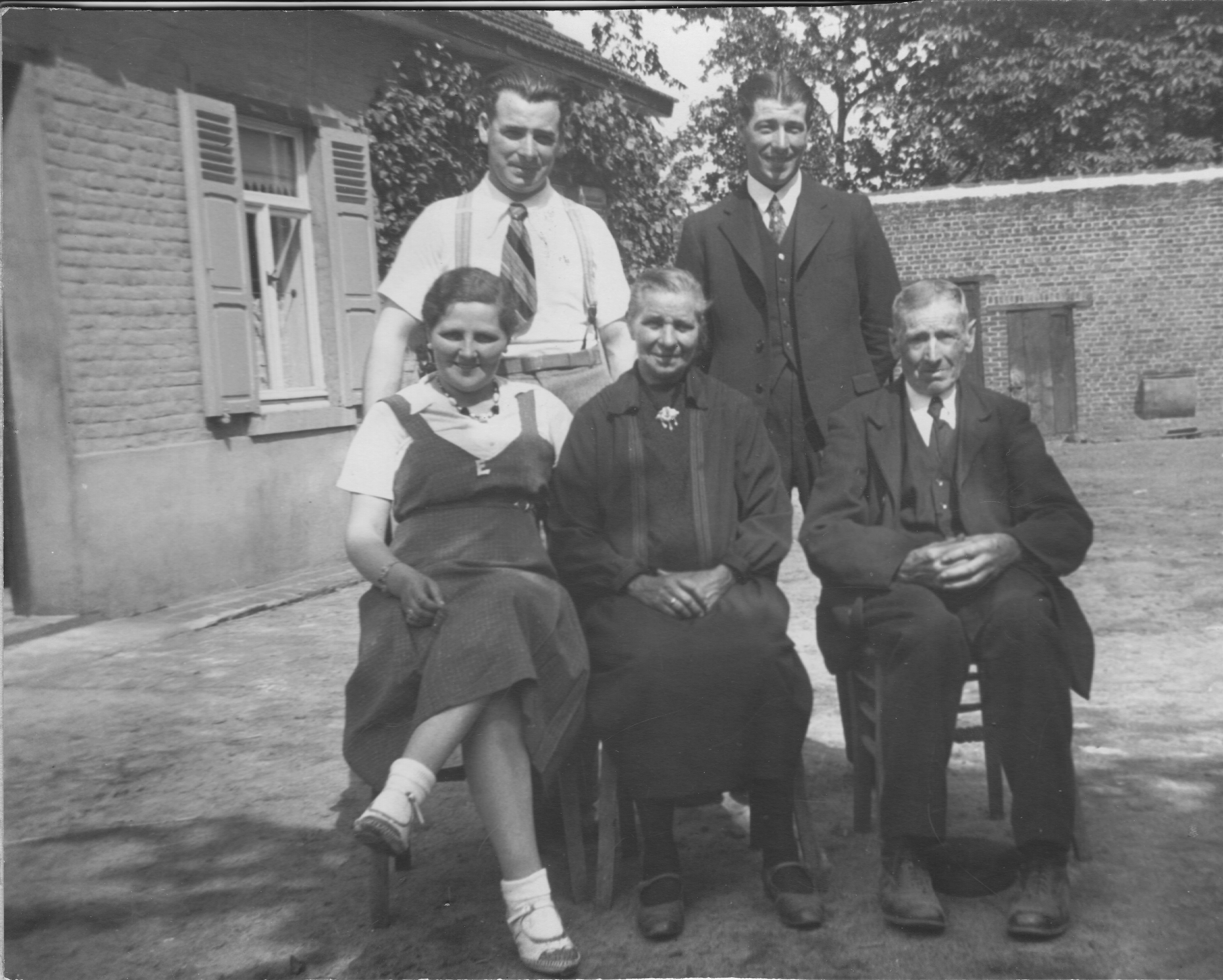 - Beschrijvingzittend: vader en moeder Verhaegen en schoondochter Elodie De Coster; rechtstaand : rechts Trifon Verhaegen, links Kamiel Verhagen