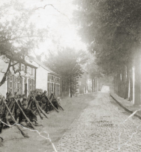 - BeschrijvingBelgische infanterie zittend tegen de huizen aan de Tiensesteenweg te Sint-Joris-Winge
