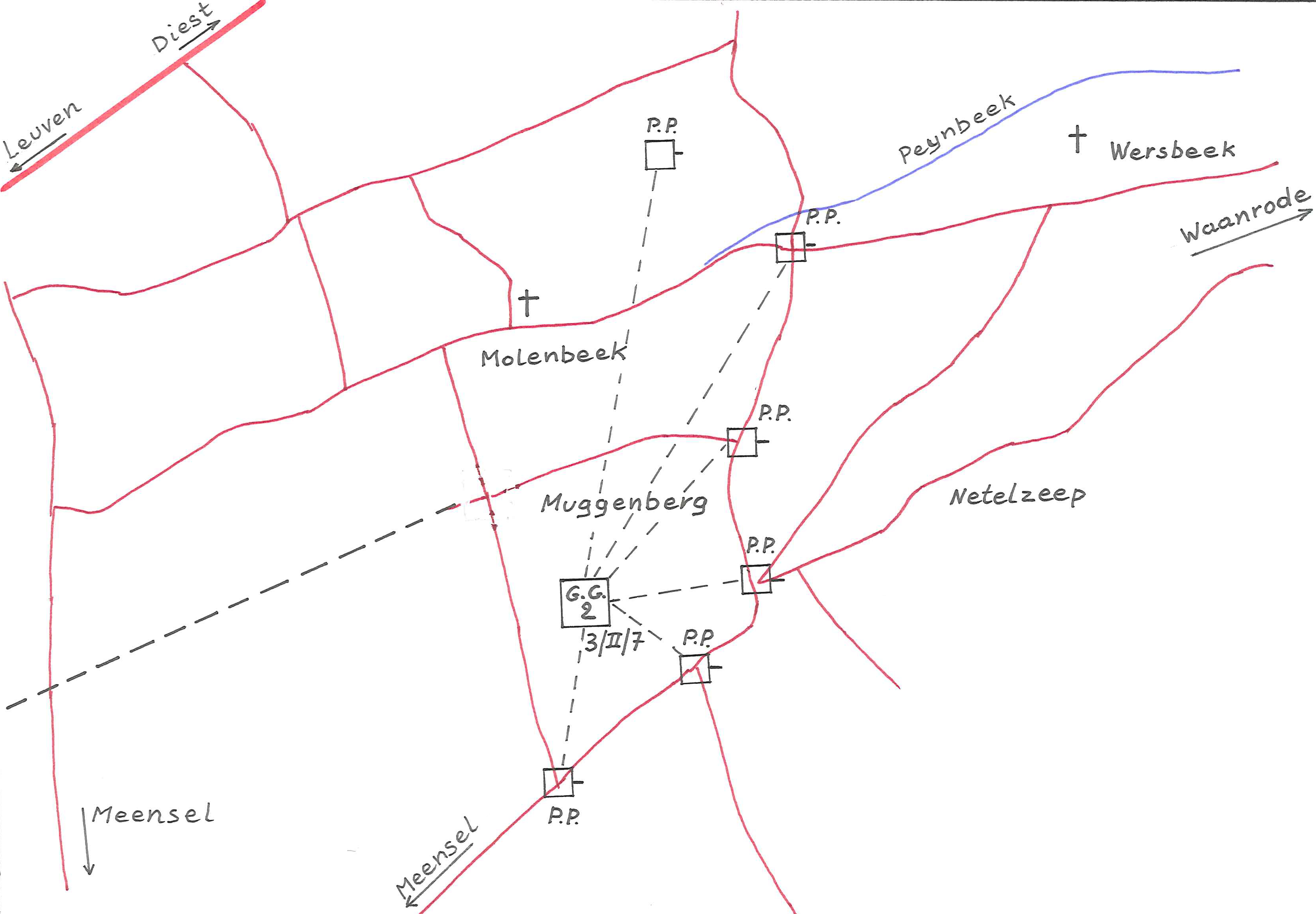 - BeschrijvingPosities van de G.G.2 (Grote Wacht 2) op Muggenberg van 13 - 19 augustus 1914