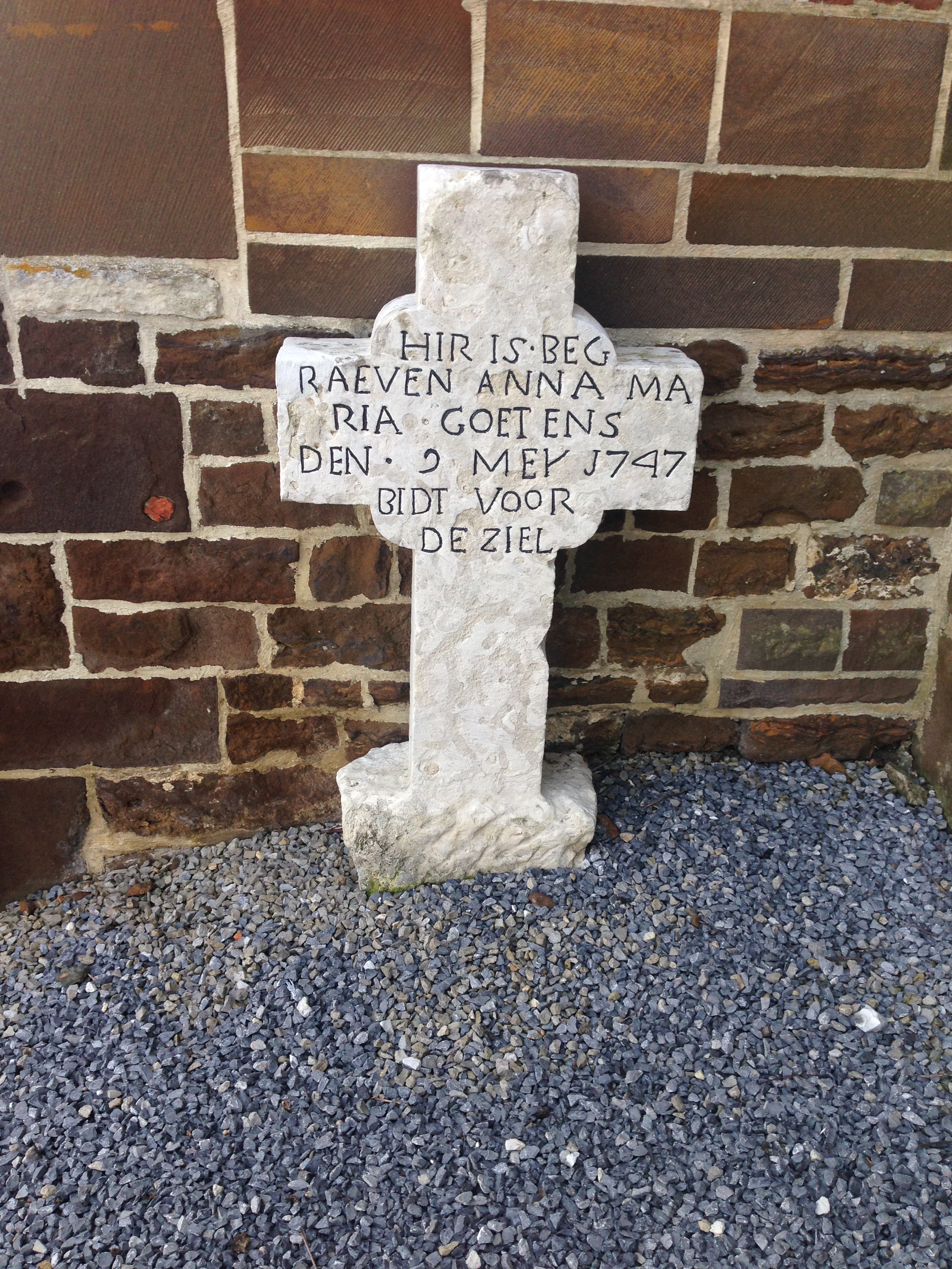 - BeschrijvingGrafsteen uit 1747 van Anna Maria Goetens : links naast de toegangspoort van de kerk Sint-Martinus. Op 9 mei 1747 werd Anna Maria Goetens, een van de zeven kinderen van Petrus Goetens en Joanna Groetejans, geraakt door een verdwaalde kogel uit een verdragend geweer met een heel lange loop. Het ongeval gebeurde tijdens een schermutseling op de nabijgelegen Oude Leuvensesteenweg tijdens de Oostenrijkse periode.