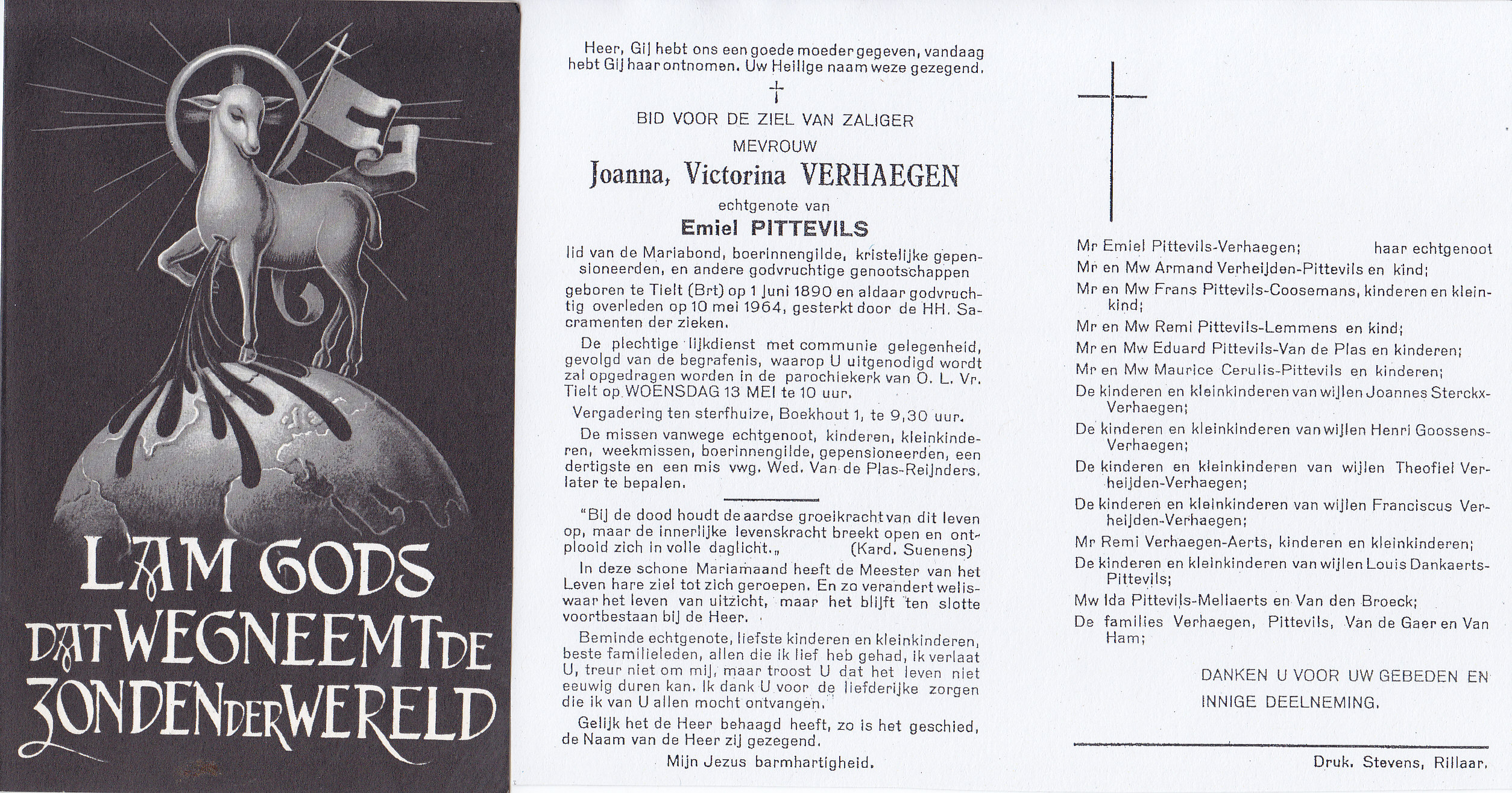 - BeschrijvingDoodsprentje Joanna, Victorina Verhaegen Echtgenote Emiel Pittevils Lid van van de Mariabond, boerinnengilde, kristelijke gepensioneerden en andere godvruchtige genootschappen