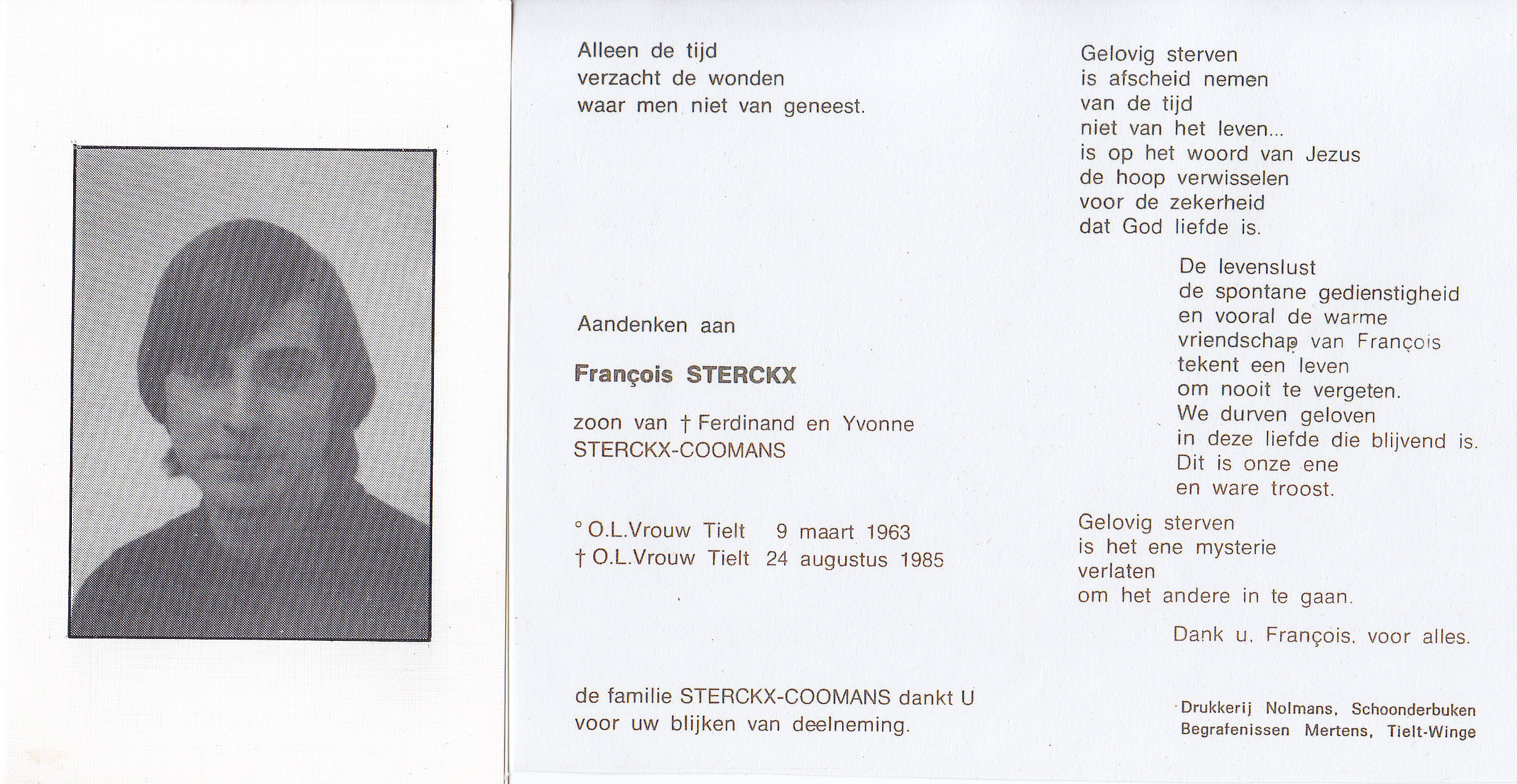 - BeschrijvingDoodsprentje François Sterckx Zoon van Ferdinand en Yvonne Sterckx-Coomans