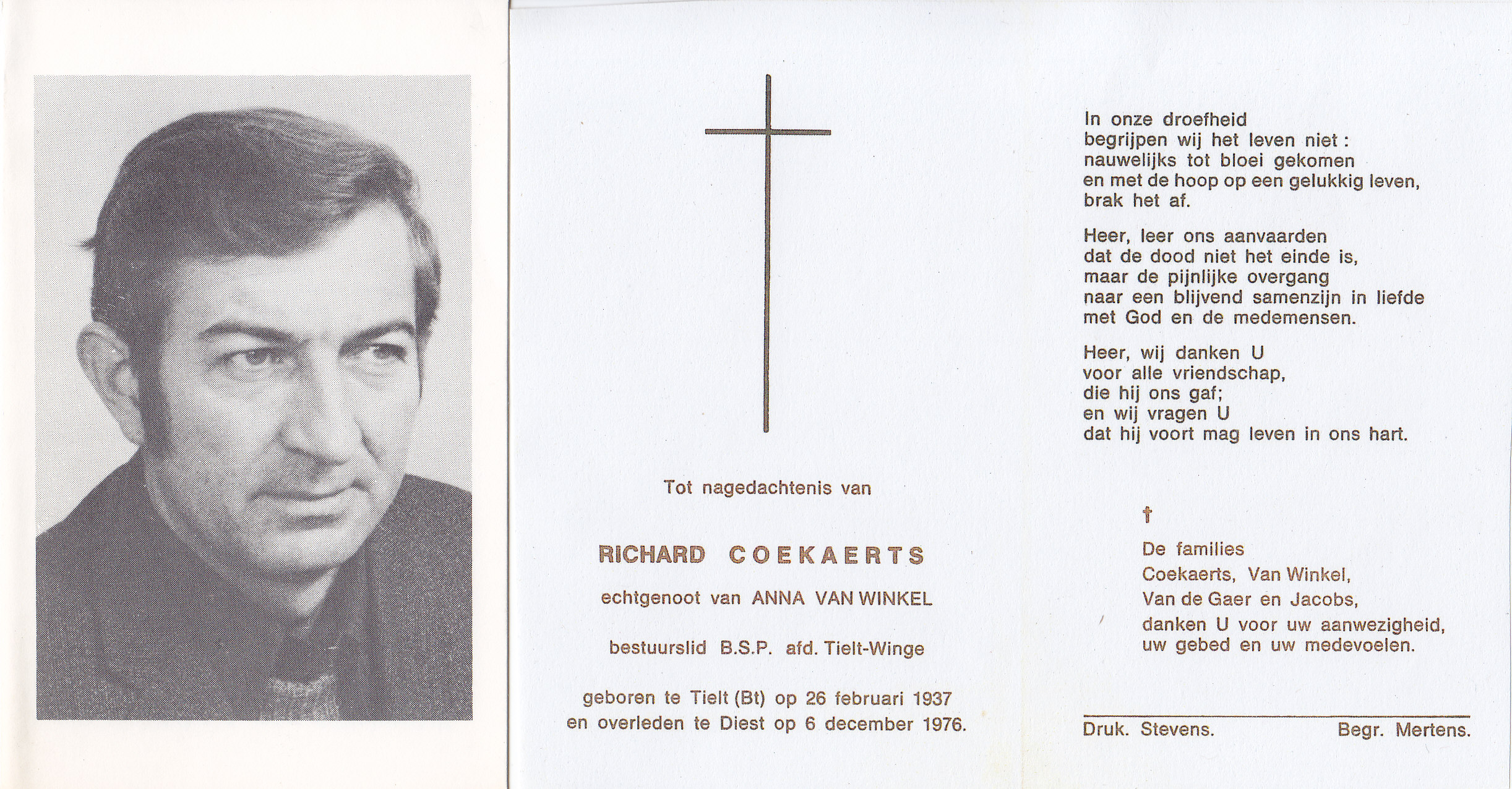 - BeschrijvingDoodsprentje Richard Coekaerts Echtgenoot van Anna Van Winkel Bestuurslid B.S.P. afd Tielt-Winge