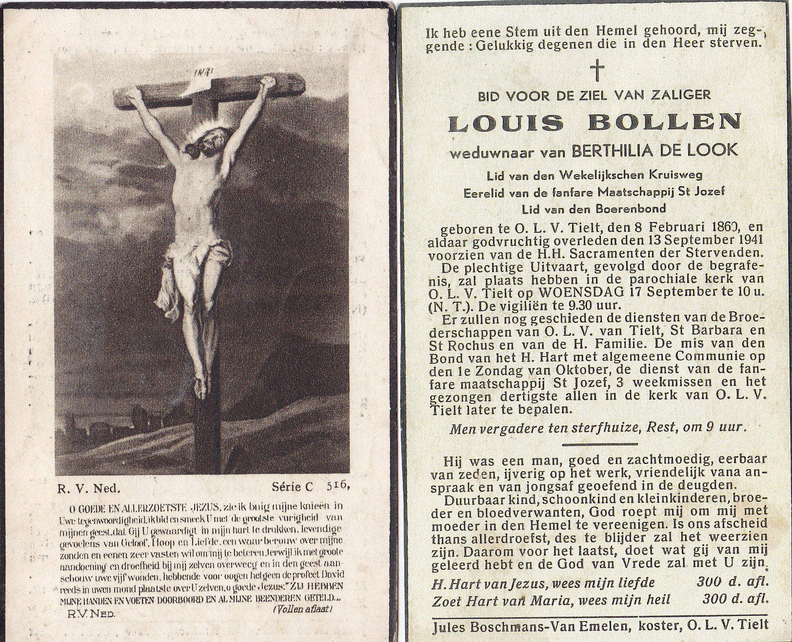 - BeschrijvingDoodsprentje Louis Bollen Weduwnaar van Berthilia De Look Lid van de Wekelijkschen Kruisweg Erelid van de fanfare Maatschappij St. Jozef Lid van den Boerenbond
