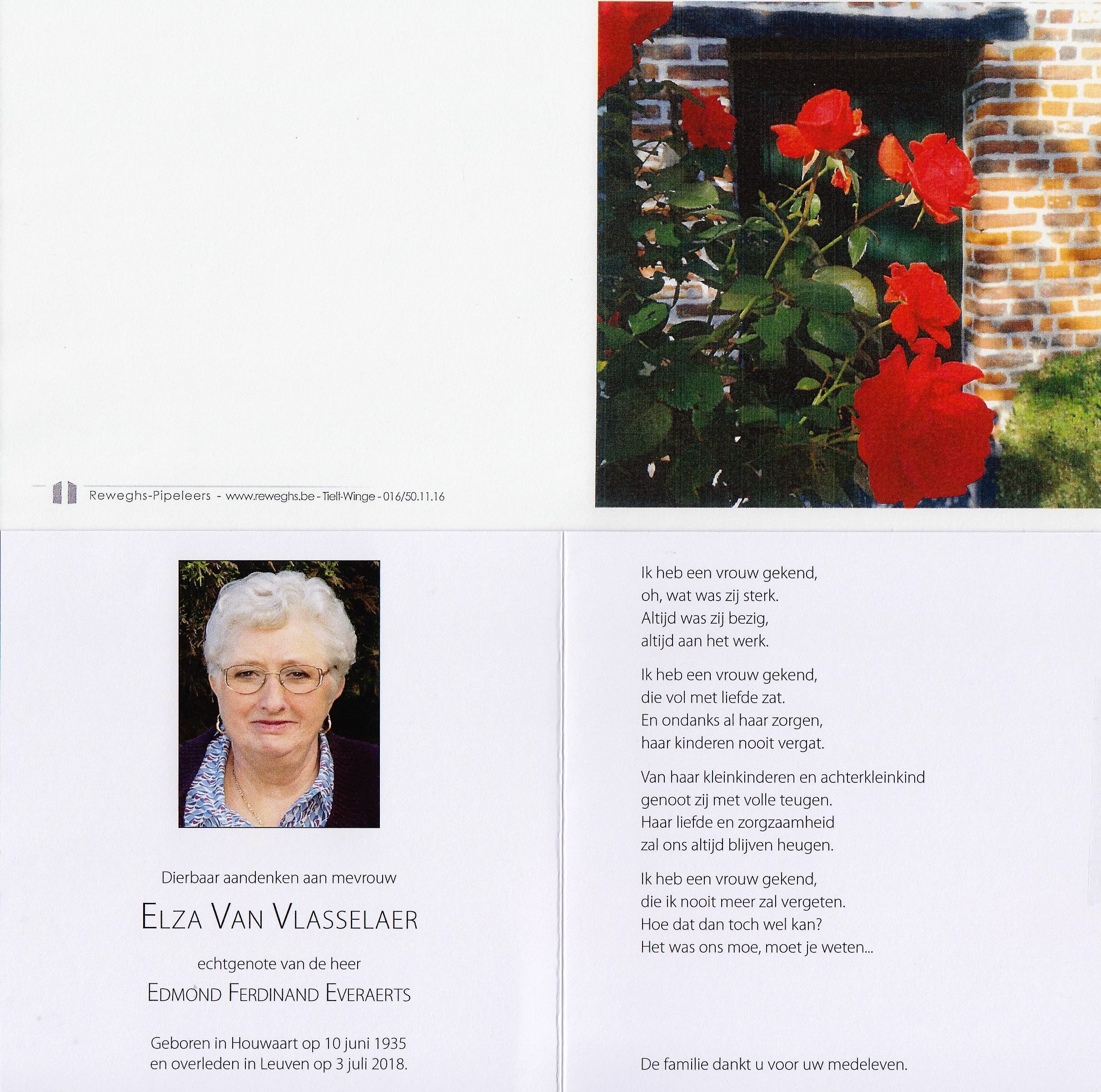 - BeschrijvingDoodsprentje van Elza Van Vlasselaer °Houwaart, 10 juni 1935 en +Leuven, 3 juli 2018 - echtgenote van de heer Edmond Ferdinand Everaerts.