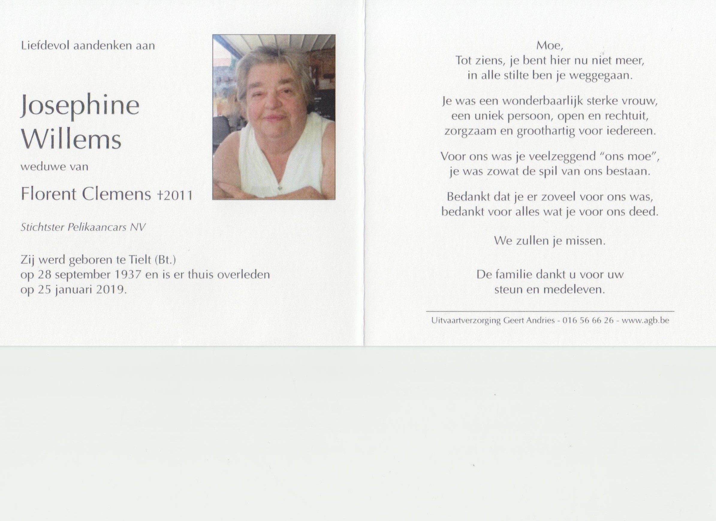 - BeschrijvingWeduwe van Florent Clemens +2011 - Stichtster NV Pelikaancars, °Tielt, 28/9/1937 en +Tielt, 25/01/2019