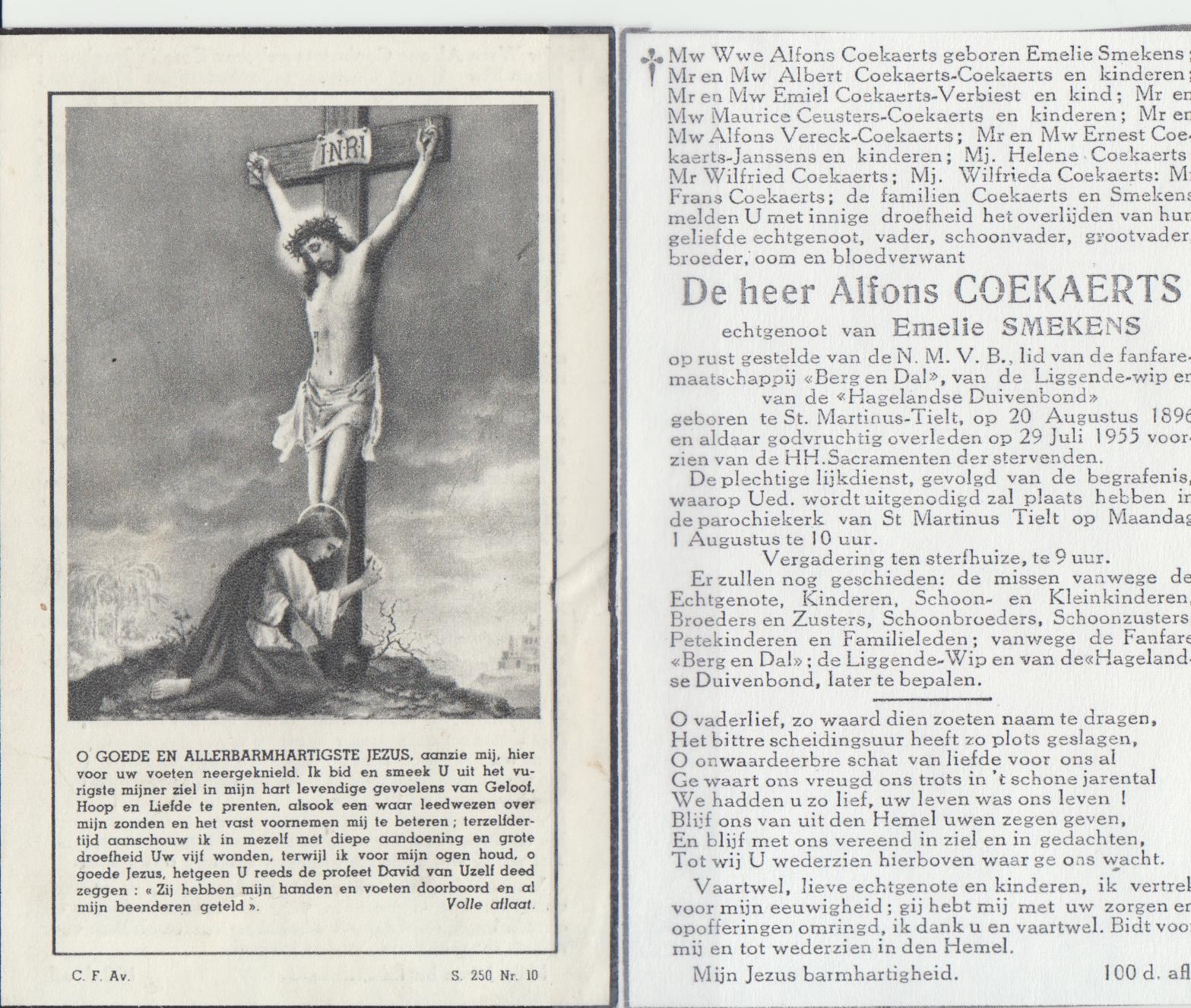- BeschrijvingDoodsprentje van Alfons Coekaerts, °St. Martinus Tielt, 20/08/1896, +29/07/1955, echtgenoot van Emelie Smekens, op rust gestelde van NMVB, lid van de fanfare Berg en Dal, van de Liggende wip en van de Hagelandse Duivenbond.