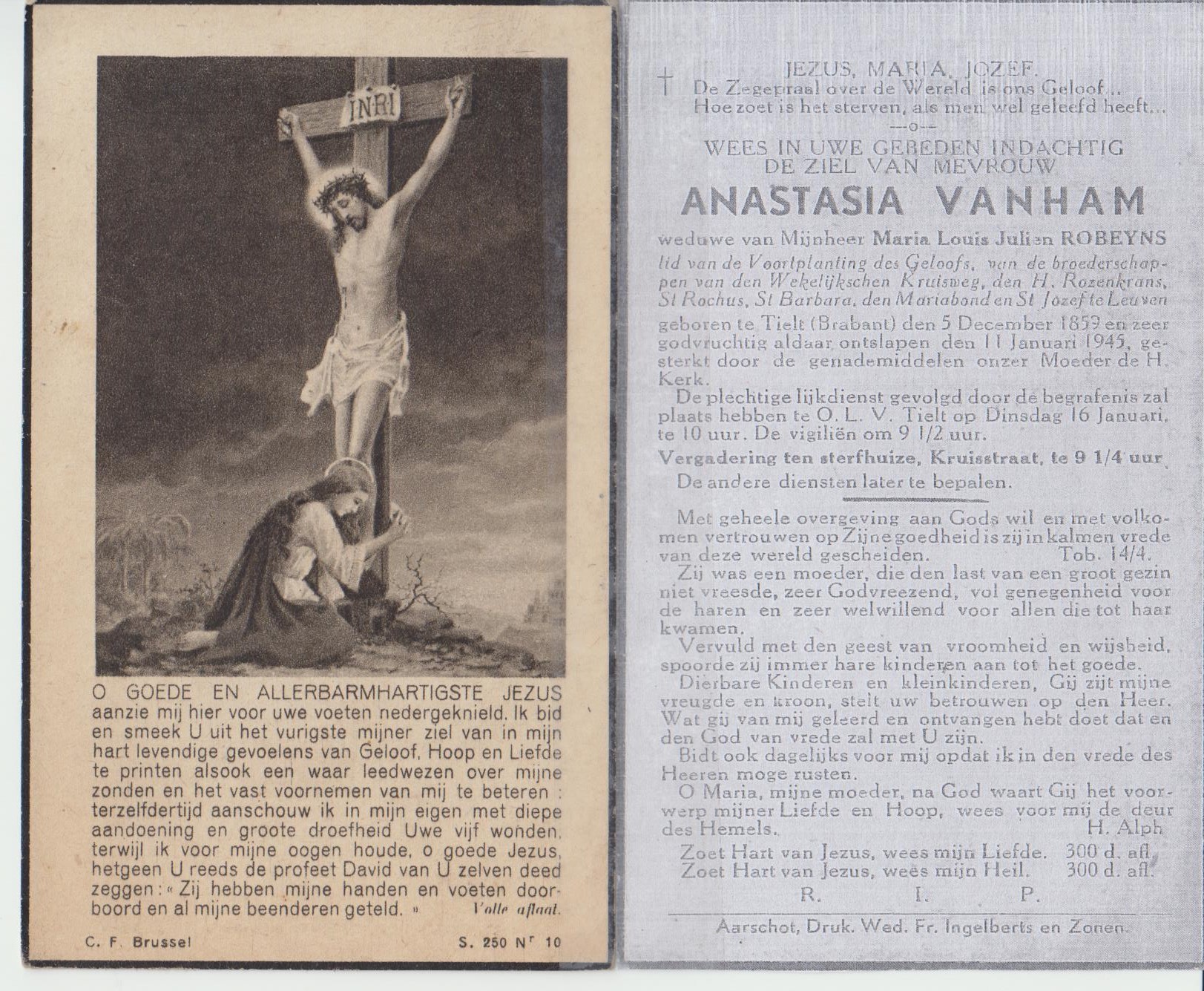 - BeschrijvingDoodsprentje Anastasia Vanham, °OLV Tielt, 5/12/1859 en +11/1/1945, weduwe van Louis Julien Maria Robeyns, lid van de Voortplanting des Geloofs, van de broederschappen van den Wekelijkschen Kruisweg, den H. Rozenkrans, St. Rochus, St. Barbara, den Mariabond en St. Jozef te Leuven.