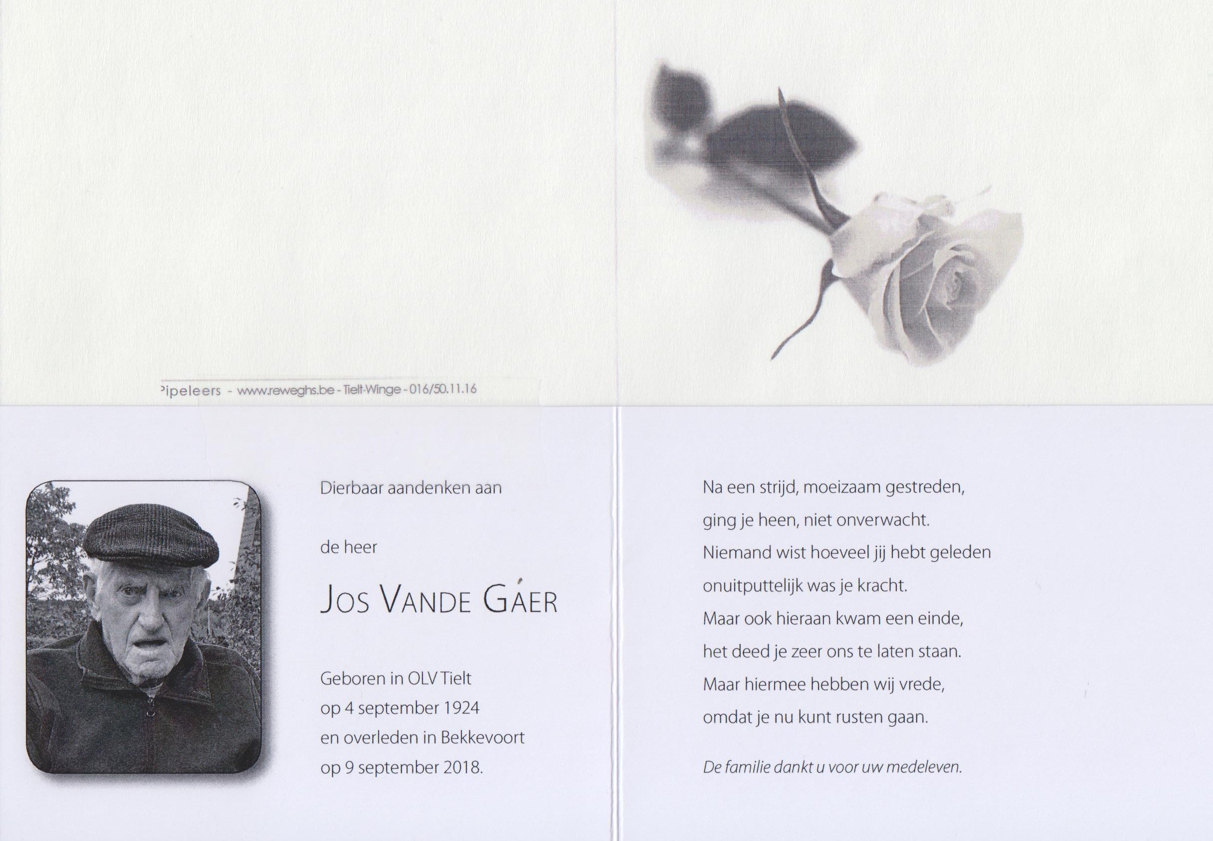 - BeschrijvingDoodsprentje Jos Vande Gaer, °OLV Tielt, 4/9/1924 en +Bekkevoort, 9/9/2018