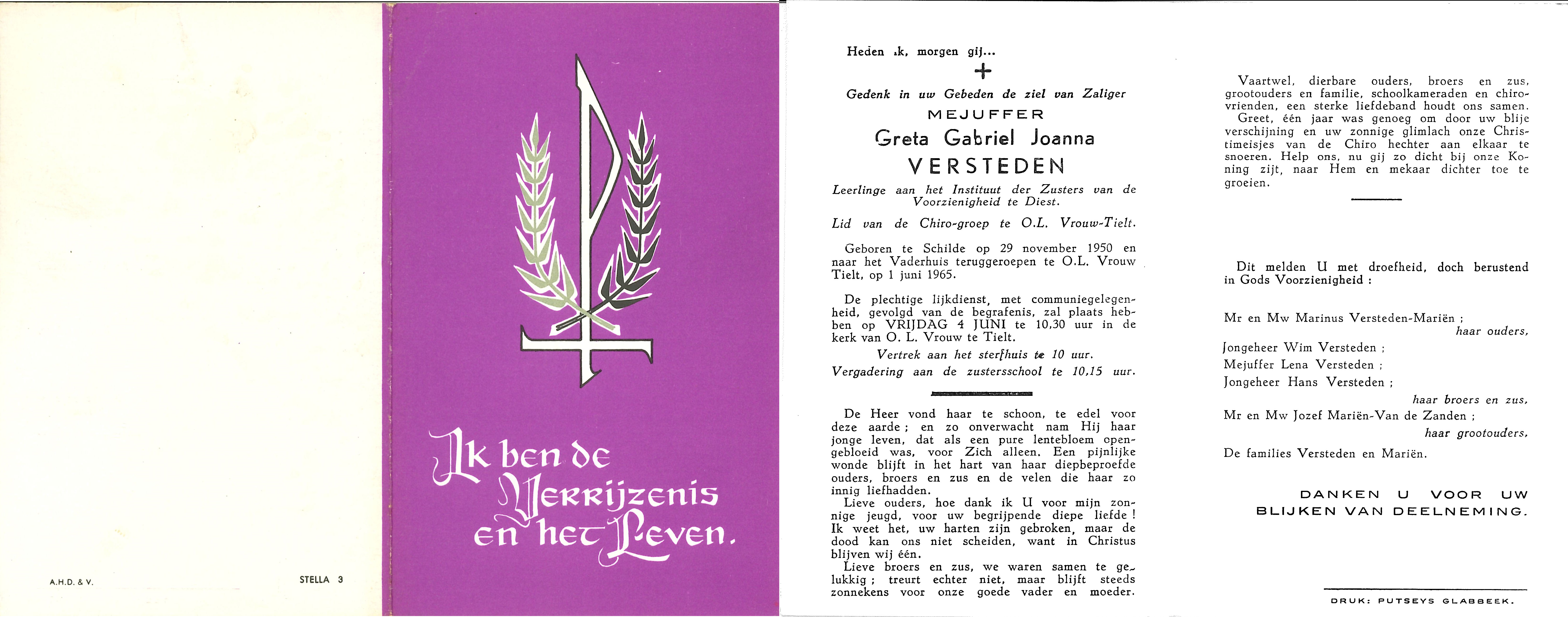 - BeschrijvingDoodsprentje van mejuffer Greta Gabriel Joanna Versteden, °Schilde, 29/11/1950, +OLV Tielt, 01/06/1965, leerlinge aan het Instituut der Zusters van de Voorzienigheid te Diest, lid van de Chiro-groep te OLV Tielt, dochter van Versteden-Mariën.