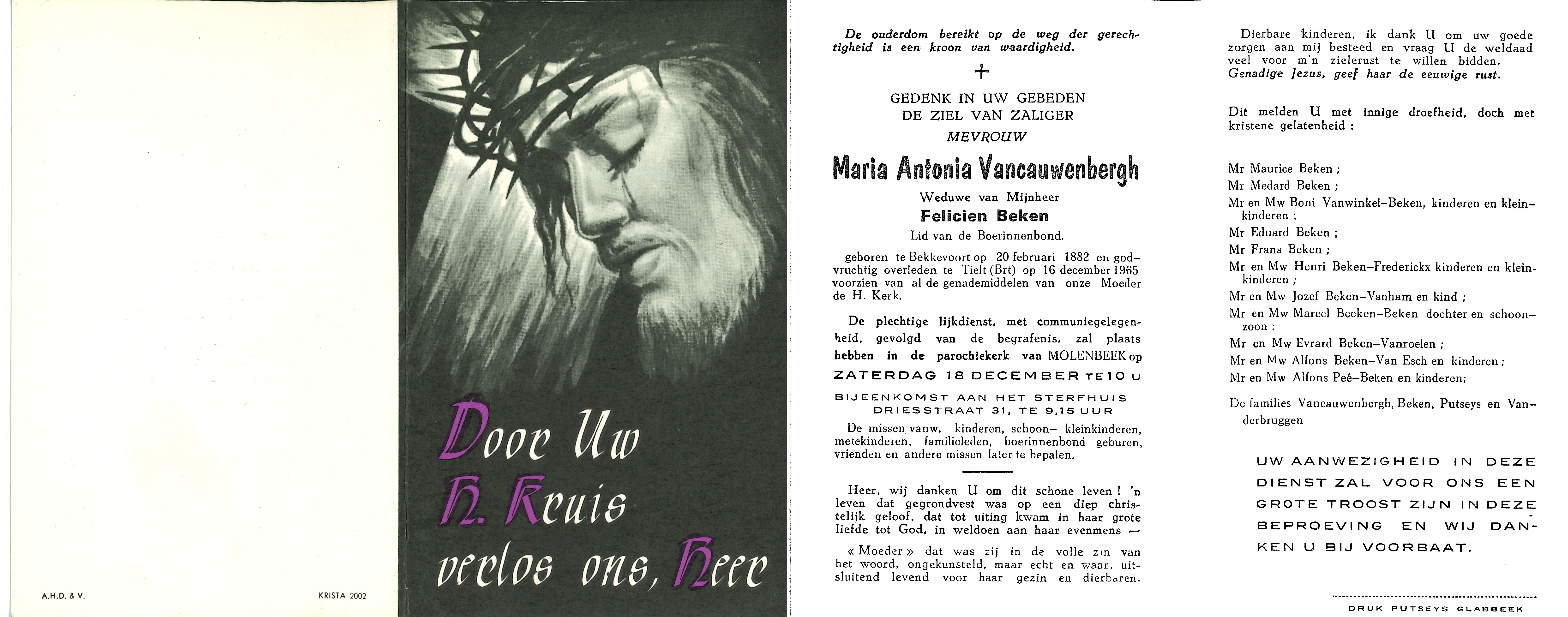 - BeschrijvingDoodsprentje Maria Antonia Vancauwenbergh °Bekkevoort, 20/02/1882 en +OLV Tielt, 16/12/1965, weduwe van Felicien Beken, lid van de Boerinnenbond, Driesstraat 31.
