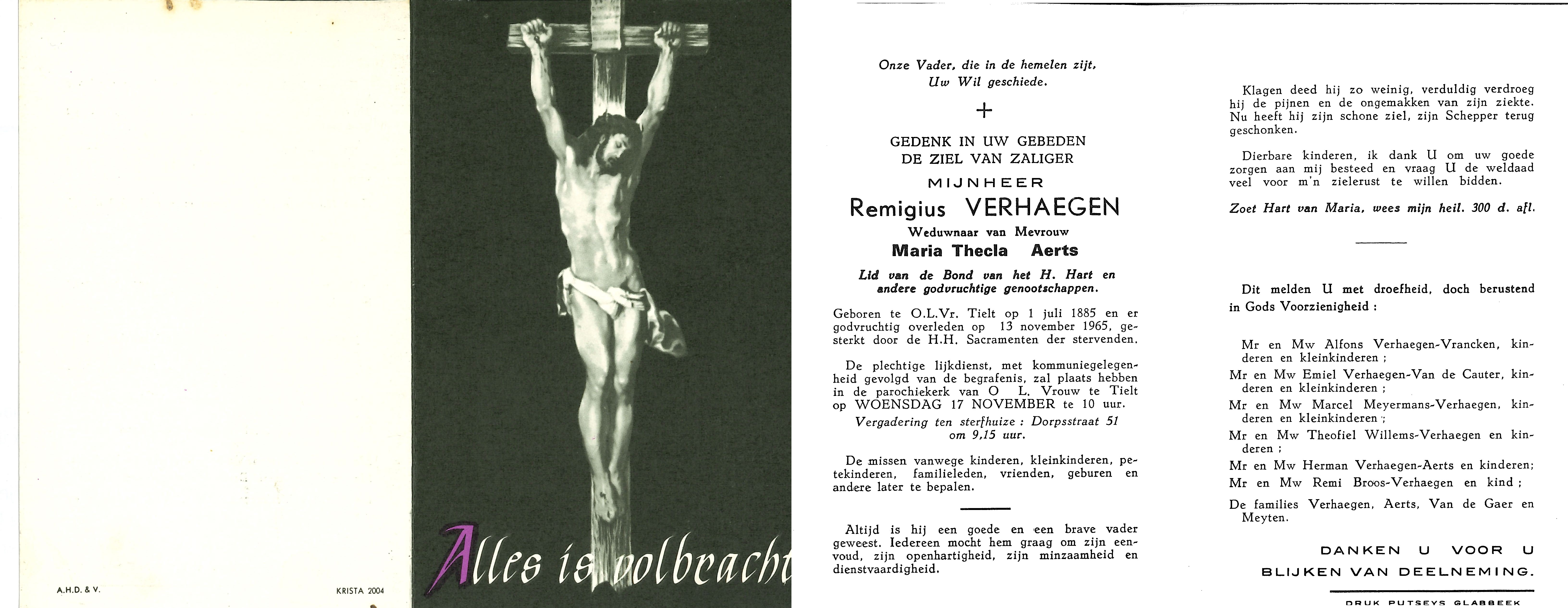 - BeschrijvingDoodsprentje Remigius Verhaegen °OLV Tielt, 01/07/1885 en +13/11/1965, lid van de Bond van het H. Hart en andere godvruchtige genootschappen, weduwnaar van Maria Thecia Aerts, Dorpsstraat 51