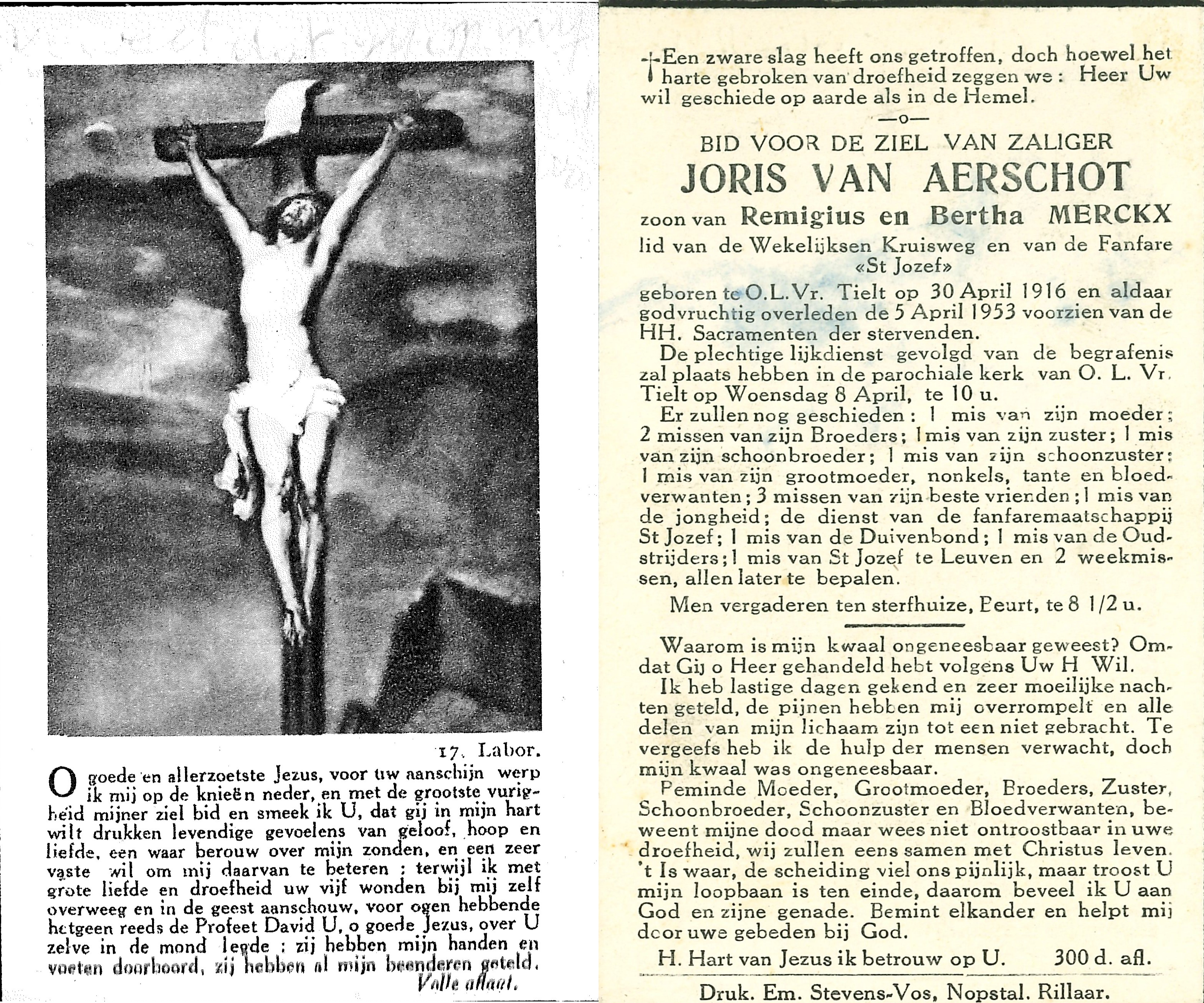 - BeschrijvingDoodsprentje Joris Van Aerschot, °OLV Tielt, 30/04/1916 en +05/04/1953, zoon van Remigius en Bertha Merckx, lid van de Wekelijksen Kruisweg en van de Fanfare St. Jozef.