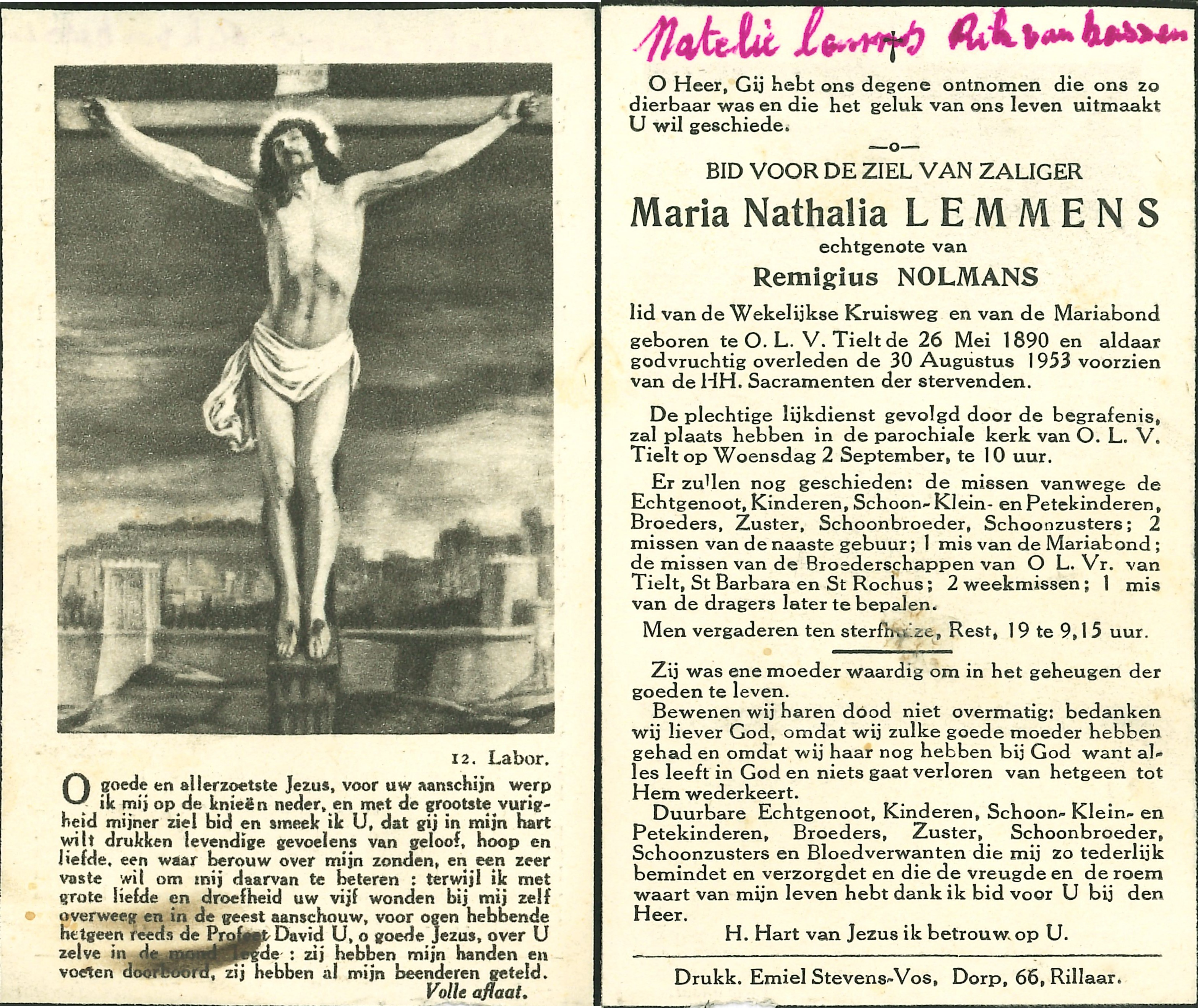 - BeschrijvingDoodsprentje Maria Nathalia Lemmens, °OLV Tielt, 26/05/1890, en er +30/08/1953, echtgenote van Remigius Nolmans, Rest 19. Lid van de Wekelijkse Kruisweg en van de Mariabond.