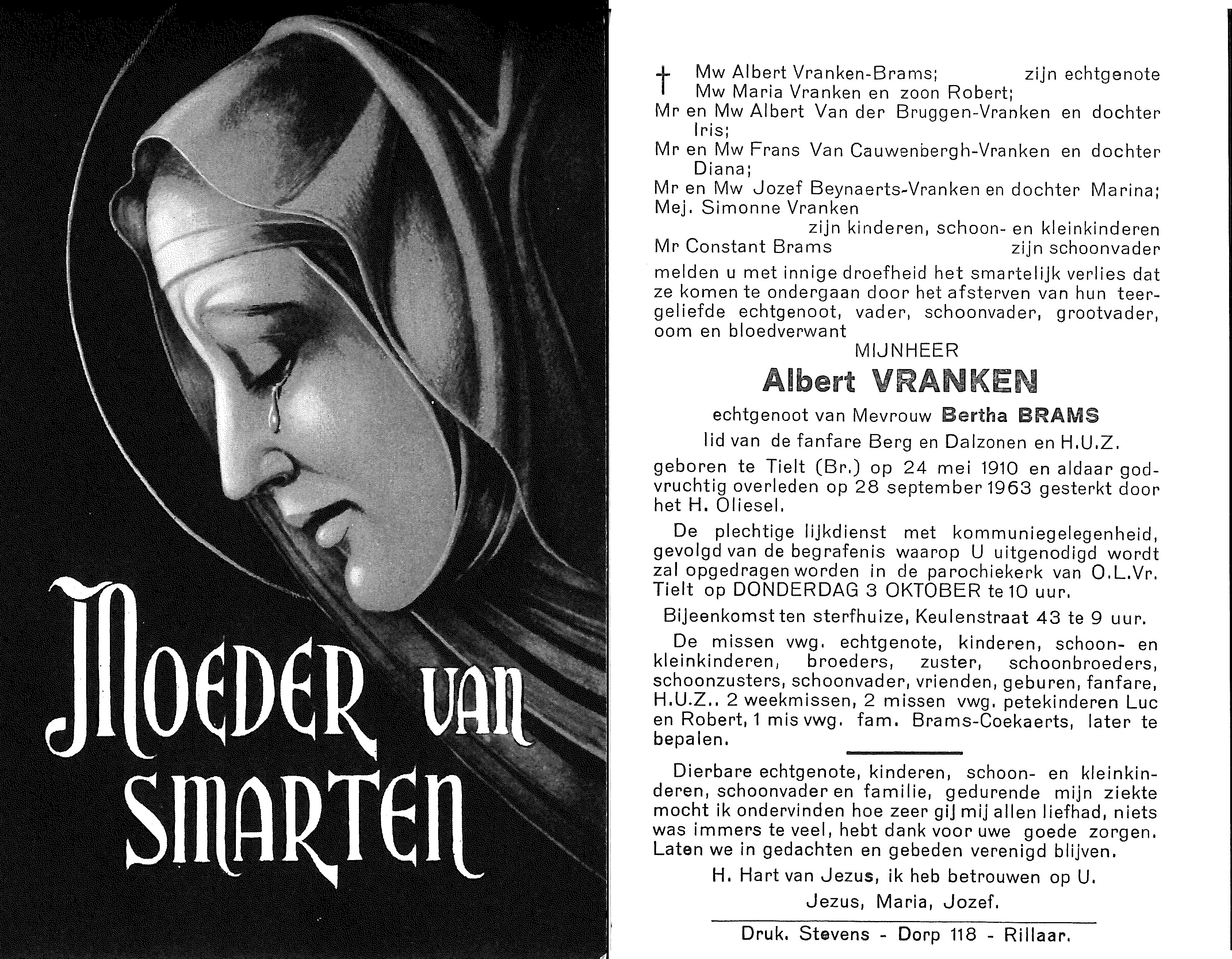 - BeschrijvingDoodsprentje Albert Vranken ° Tielt (Br) 24/05/1910 en er +28/09/1963, echtgenoot van Bertha Brams - Keulenstraat 43, lid van de fanfare Berg en Dalzonen en H.U.Z.
