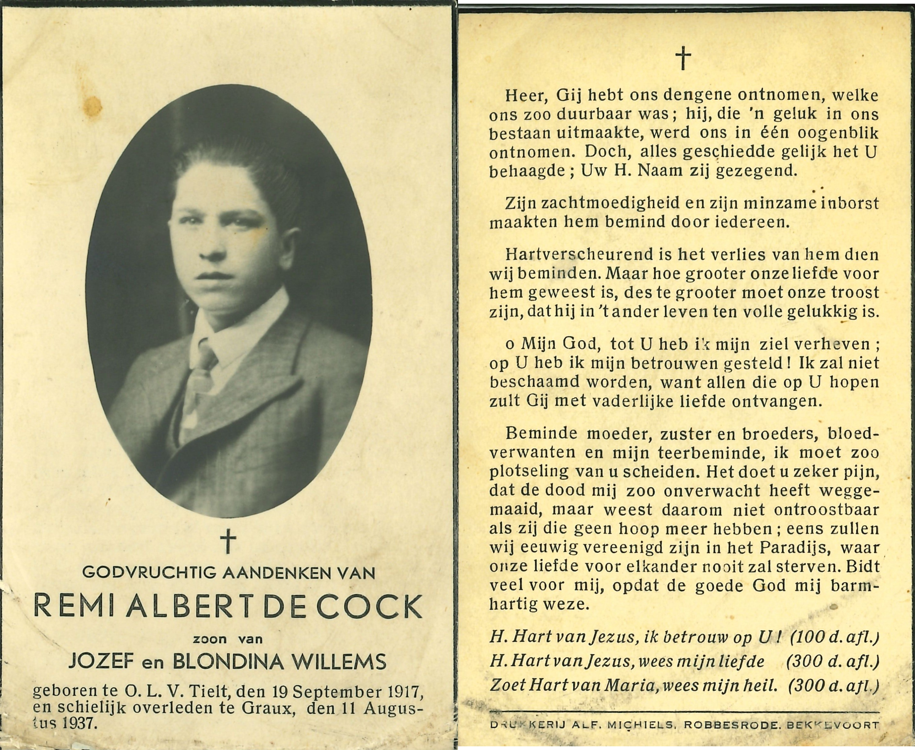 - BeschrijvingDoodsprentje van Remi Albert De Cock °OLV Tielt, 19/09/1917 en +Graux, 11/08/1937, zoon van Jozef en Blondina Willems