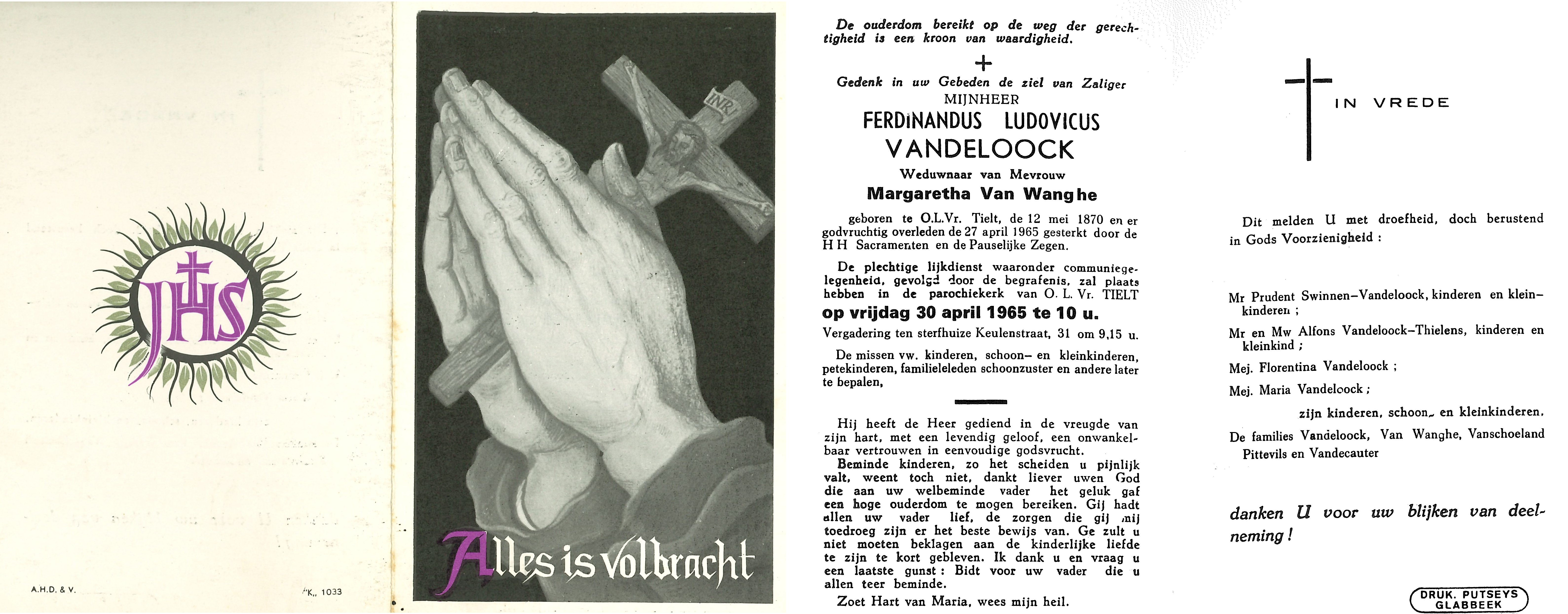 - BeschrijvingDoodsprentje van Ferdinandus Ludovicus Vandeloock °OLV Tielt,12/05/1870 en er +27/04/1965, weduwnaar van Margaretha Van Wanghe - Keulenstraat 31.