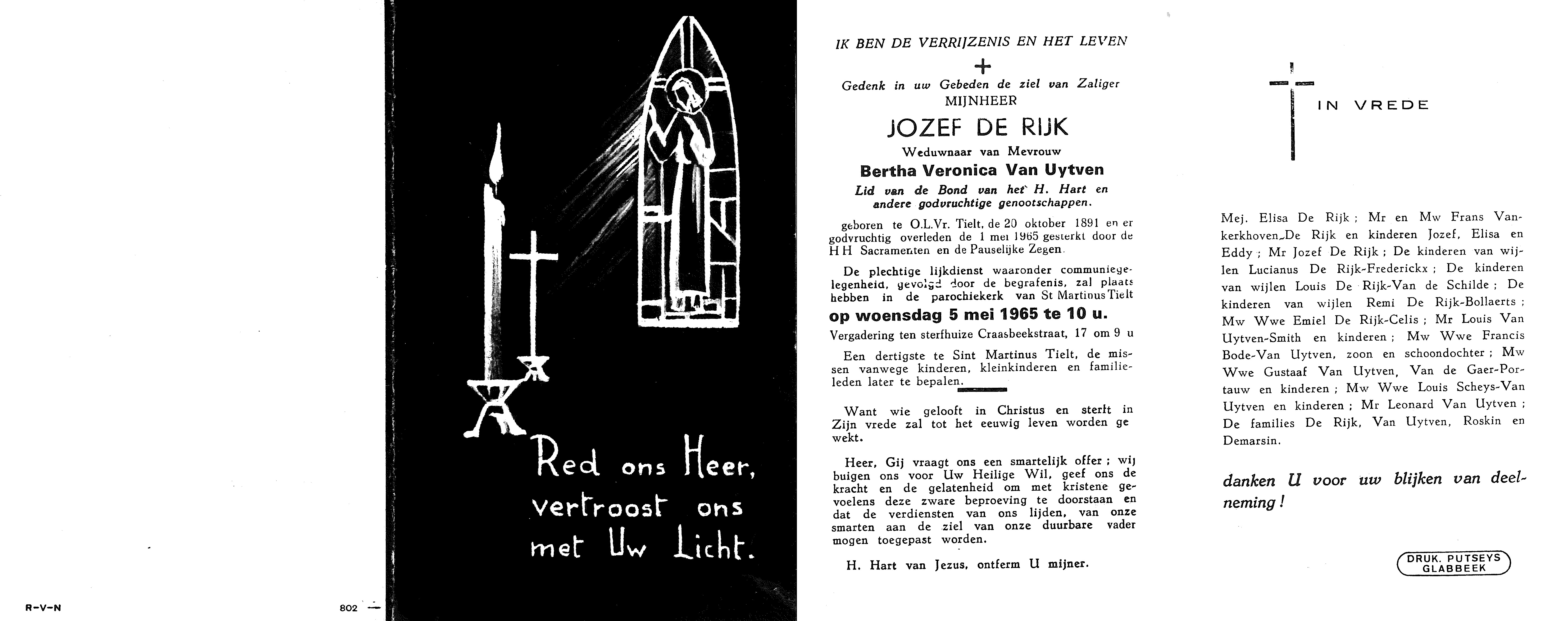 - BeschrijvingDoodsprentje Jozef De Rijk °OLV Tielt, 20/10/1891 en er +01/05/1965, weduwnaar van Bertha Veronica Van Uytven, Craasbeekstraat 17, lid van de Bond van het H. Hart en andere godvruchtige genootschappen.