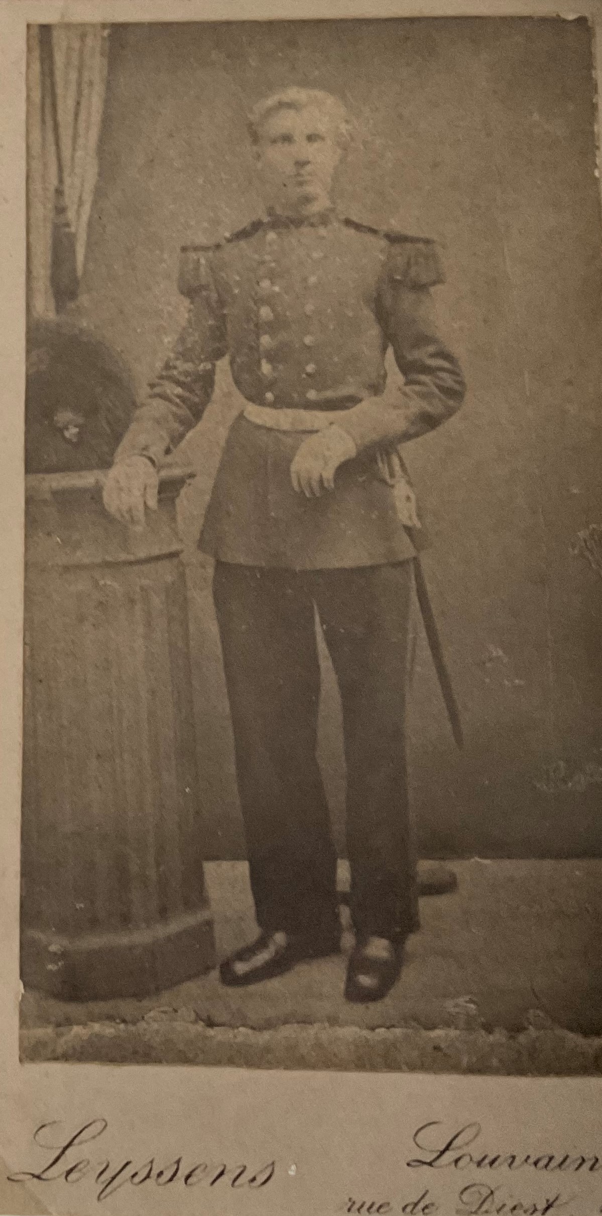 - BeschrijvingFoto van Jef Jochmans als soldaat in 1870 ten tijde van de Frans-Pruisische oorlog toen Belgische eenheden de grens met Frankrijk diende te bewaken. Jef stierf als burgerlijk oorlogsslachtoffer, hij was de de vader van Franscisca (+1962) en grootvader van Emiel De Keyzer (+1996 en vader van René).