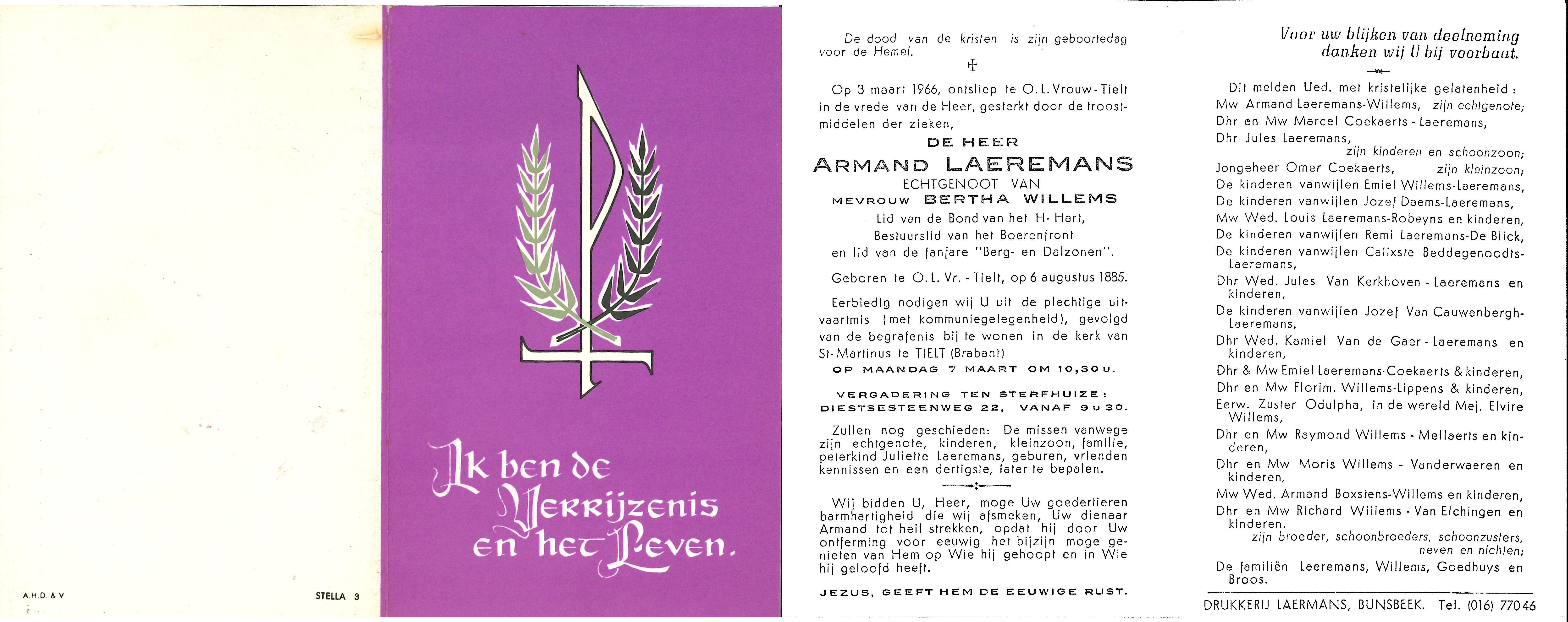 - BeschrijvingDoodsprentje Armand Laeremans °OLV Tielt, 06/08/1885 en er +03/03/1966, echtgenoot van Bertha Willems, Diestsesteenwegf 22. Lid van de Bond van het H. Hart, bestuurslid van het Boerenfront en lid van fanfare Berg- & Dalzonen.