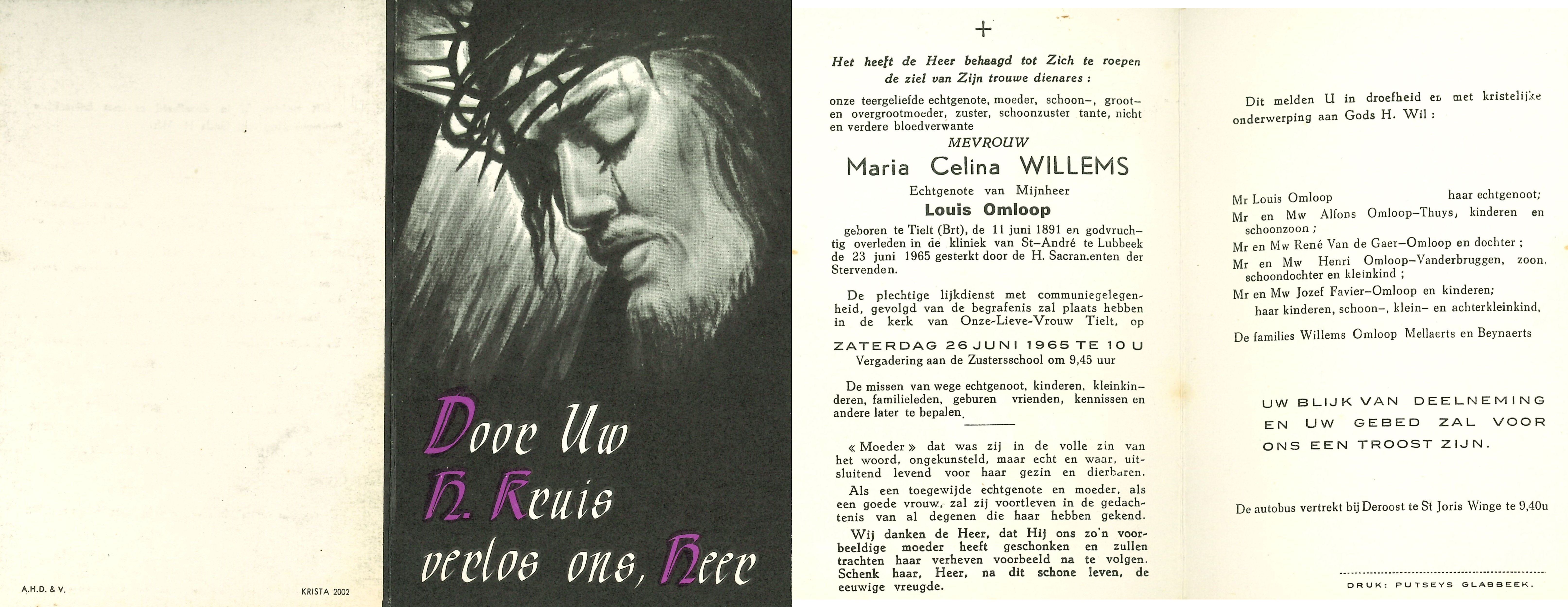 - BeschrijvingDoodsprentje Maria Celina Willems, °Tielt (Br) 11/06/1891 en +St. Andrékliniek Lubbeek, 23/06/1965, echtgenote van Louis Omloop.