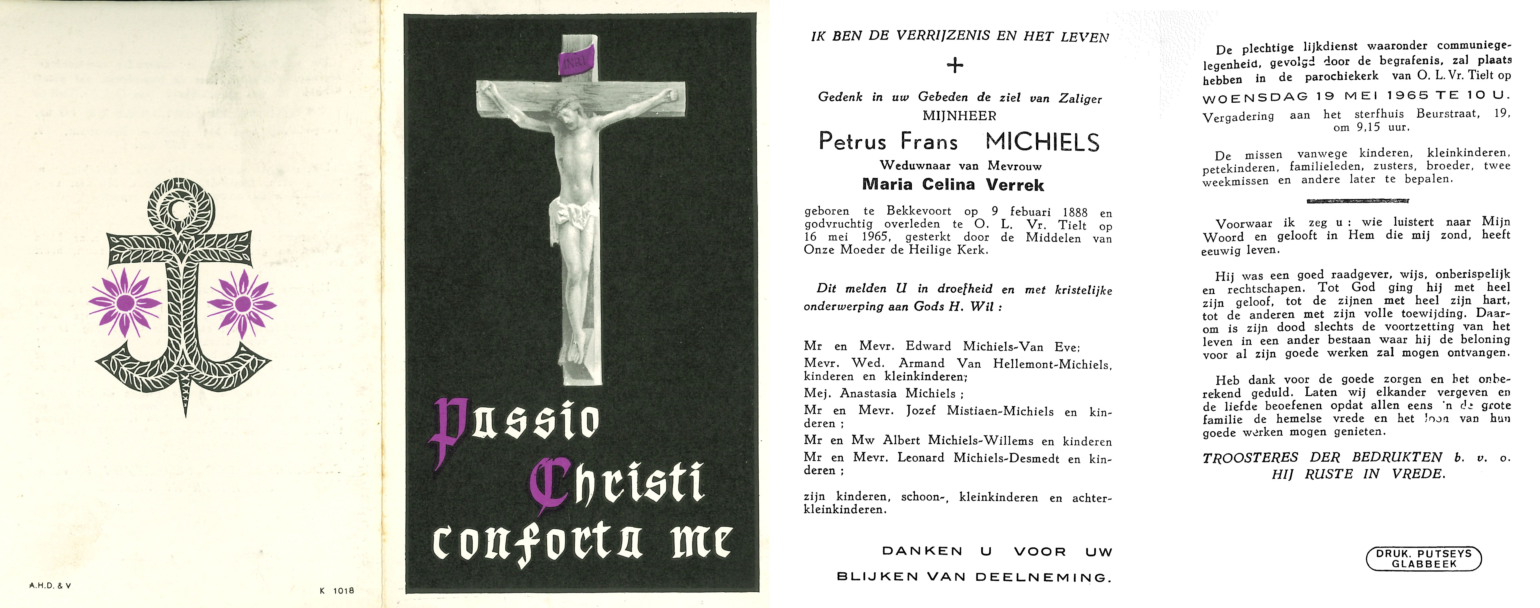 - BeschrijvingDoodsprentje Petrus Frans Michiels, °Bekkevoort, 09/02/1888 en +OLV Tielt, 16/05/1965, echtgenoot van Maria Celina Verrek, Beurtstraat 19