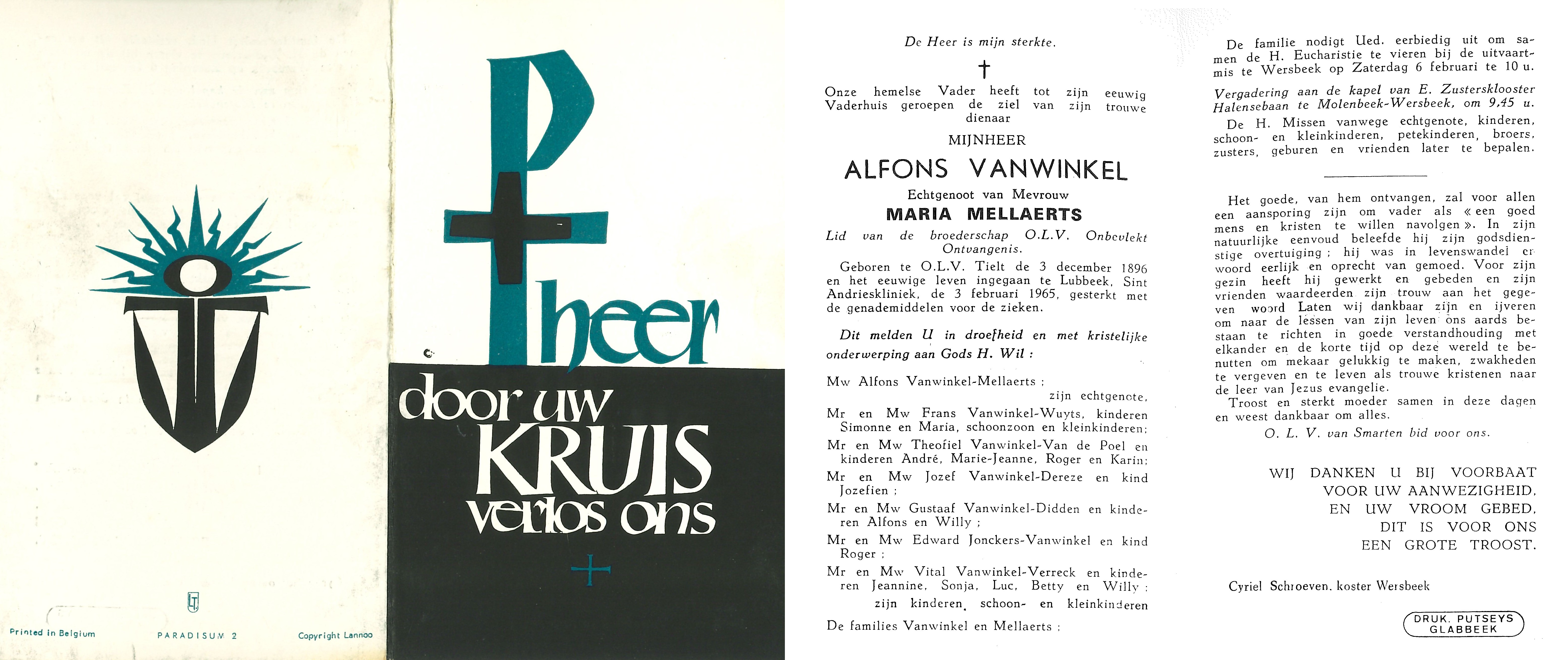 - BeschrijvingDoodsprentje Alfons Vanwinkel °OLV Tielt,03/12/1896 en + Lubbeek St. Andrékliniek, 03/02/1965, echtgenoot van Maria Mellaerts, lid van de broederschap OLV Onbevlekt Ontvangenis.