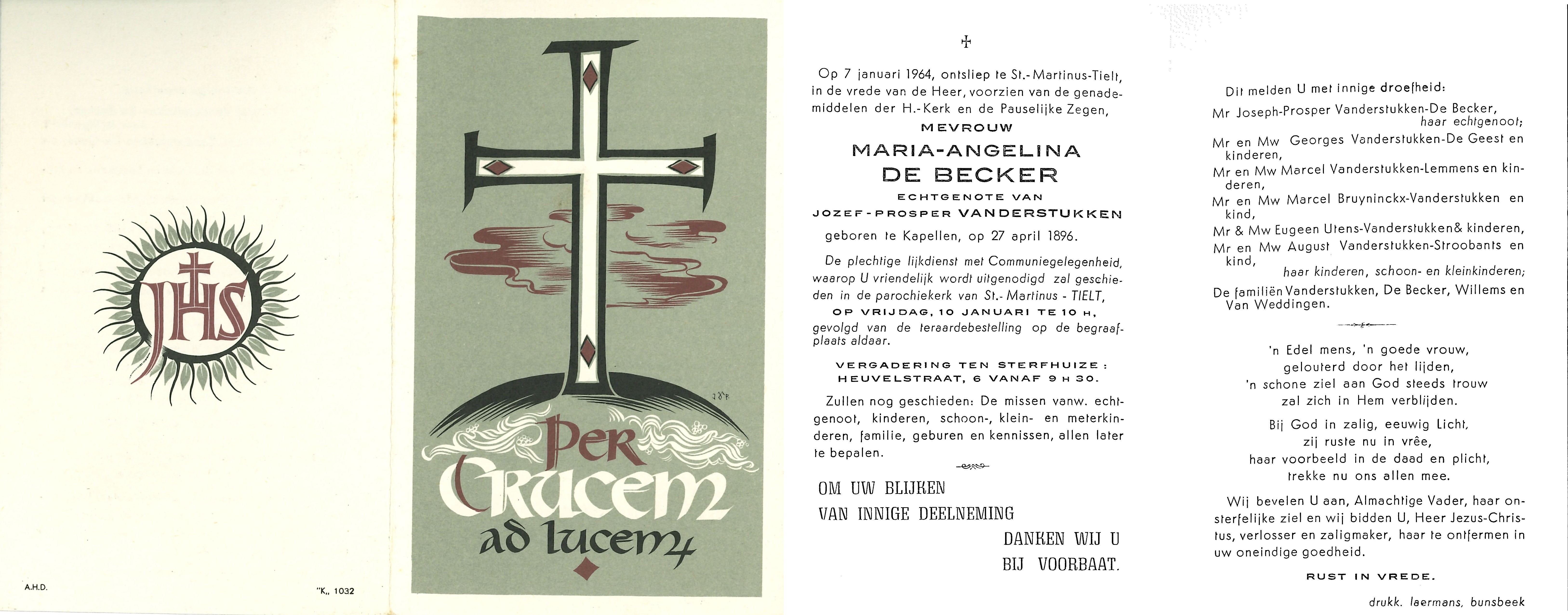 - BeschrijvingDoodsprentje Maria-Angelina De Becker °Kapellen, 27/04/1896 en +OLV Tielt, 07/01/1964, echtgenote van Josef Prosper Vanderstukken, Heuvelstraat 6.