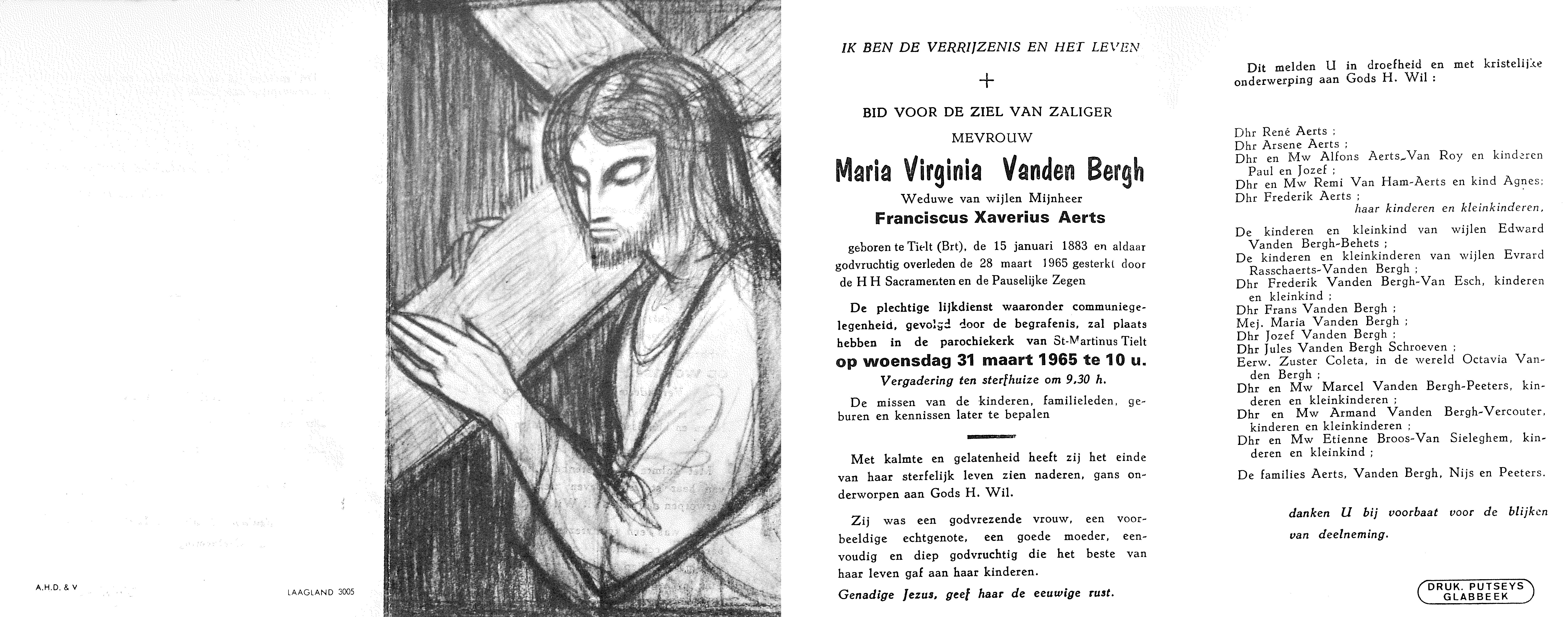 - BeschrijvingDoodsprentje Maria Virginia Vanden Bergh°Tielt (Br), 15/01/1883 en er +28/03/1965 weduwe van Franciscus Xaverius Aerts