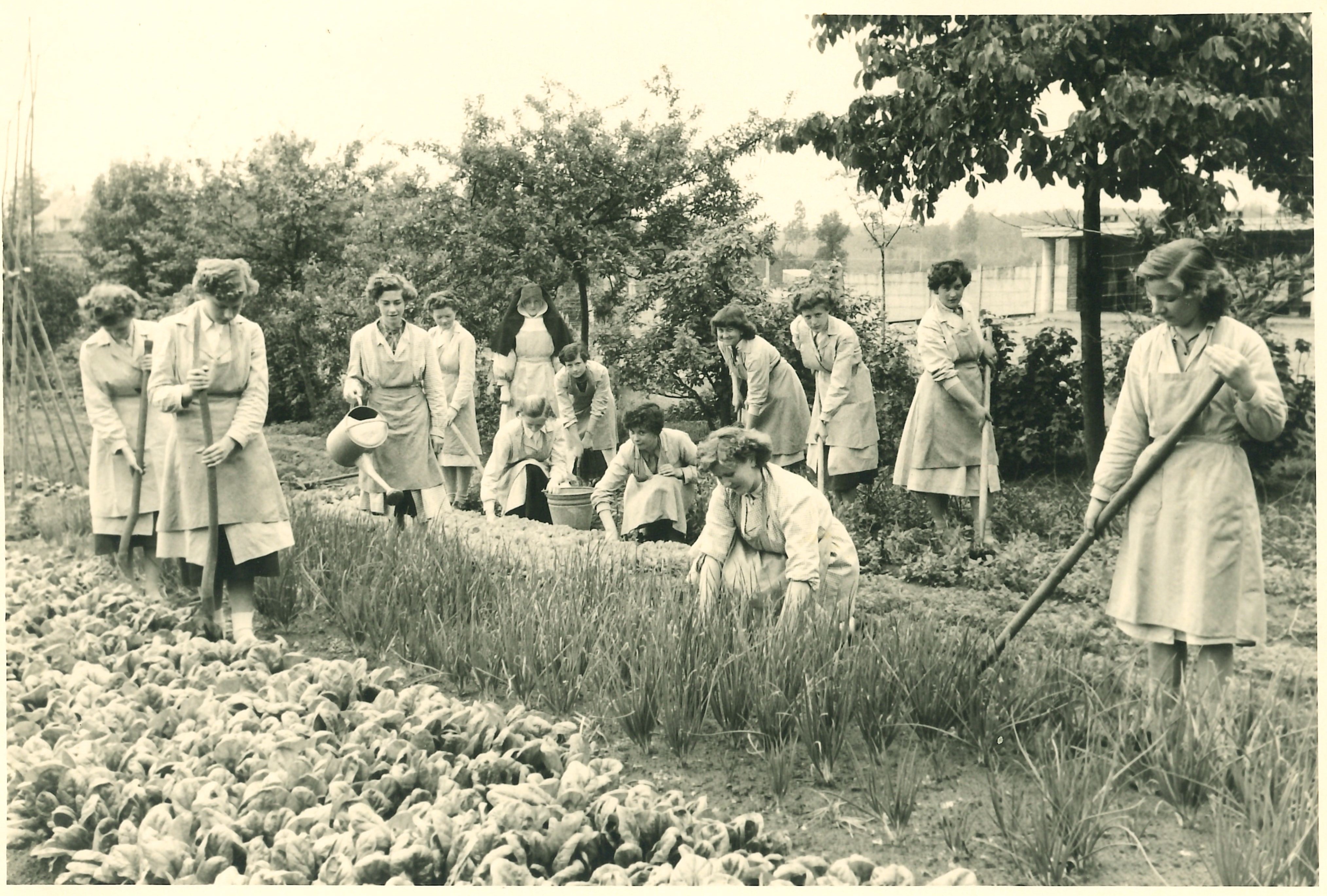 - BeschrijvingDe leerlingen van het 1e jaar huishoudschool zijn bezig aan een tuinexamen. Jaartal: 1955