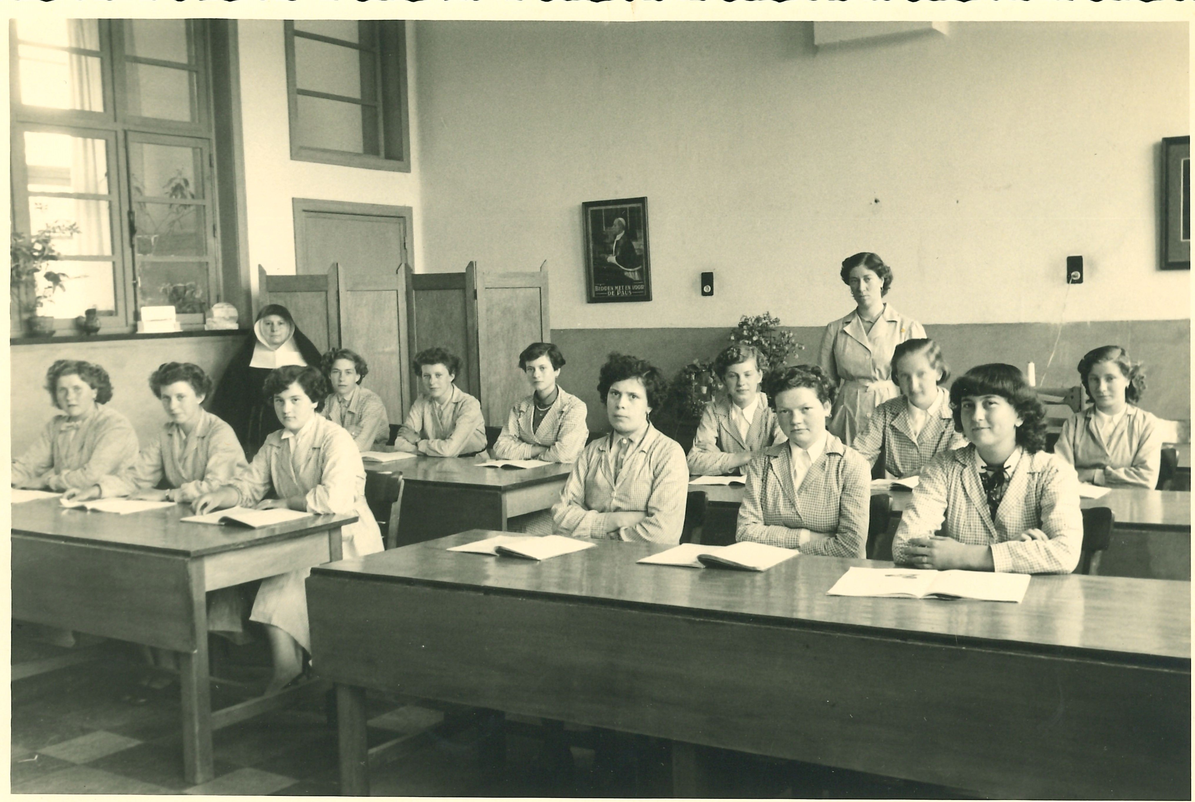 - BeschrijvingKlasfoto van het 2e jaar huishoudschool - 1956