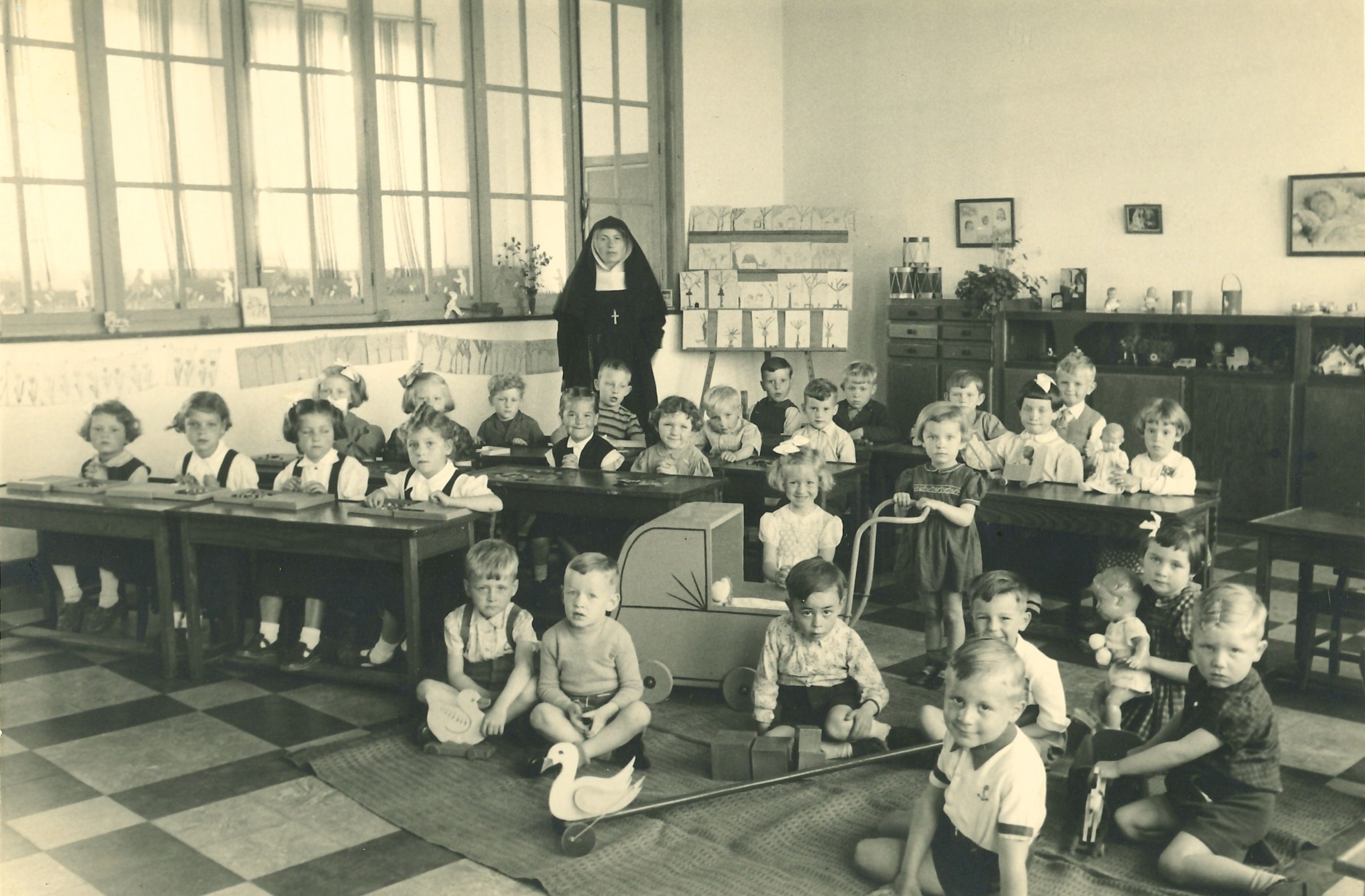 - BeschrijvingKlasfoto wijkschool Salve Mater 1955-56