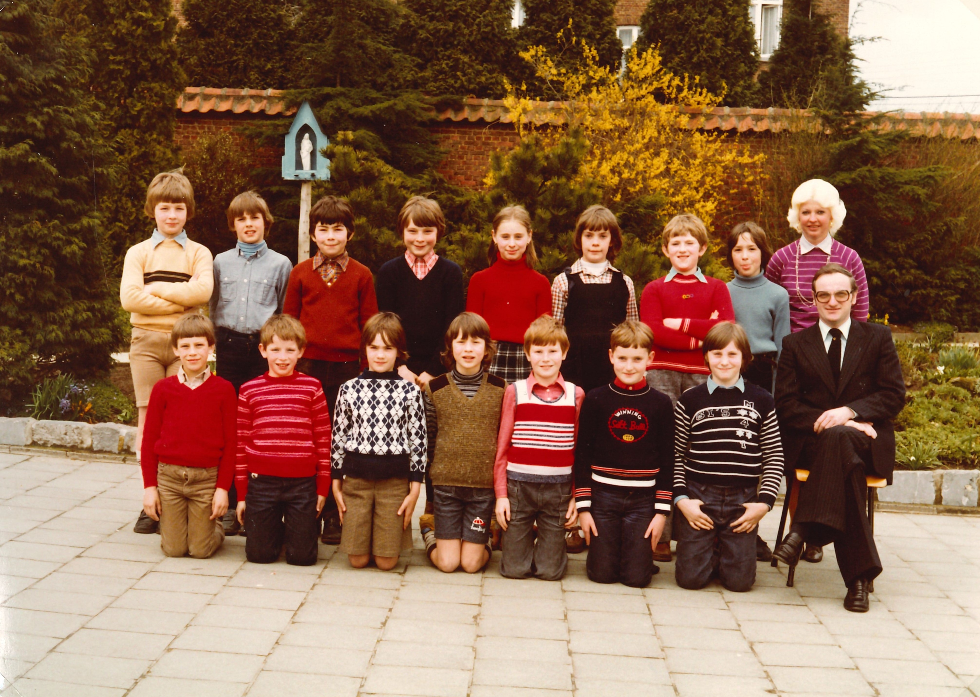 - BeschrijvingKlasfoto vierde leerjaar 1979-1980 bovenste rij: x, x, Jan Hermans, x, x, x, x, x, x onderste rij: x, x, Katty Verstraeten, x, x, x, x, Willy Coomans