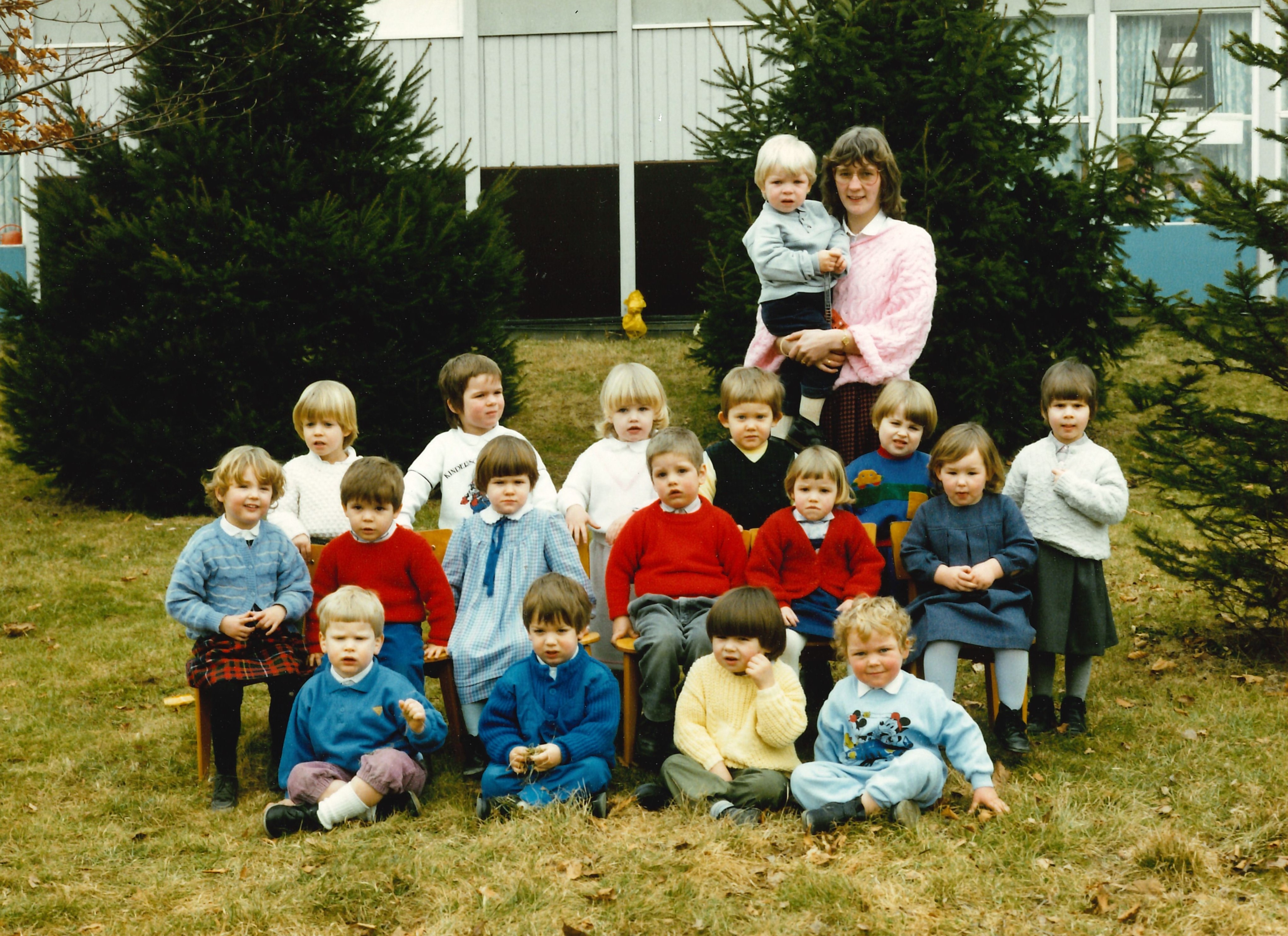 - Beschrijvingklasfoto kleuterklasje 1985-86 juf Mia Broos met Rob Verheyden op de arm vooraan v l n r: x, x, Jurgen Vanderwaeren, x