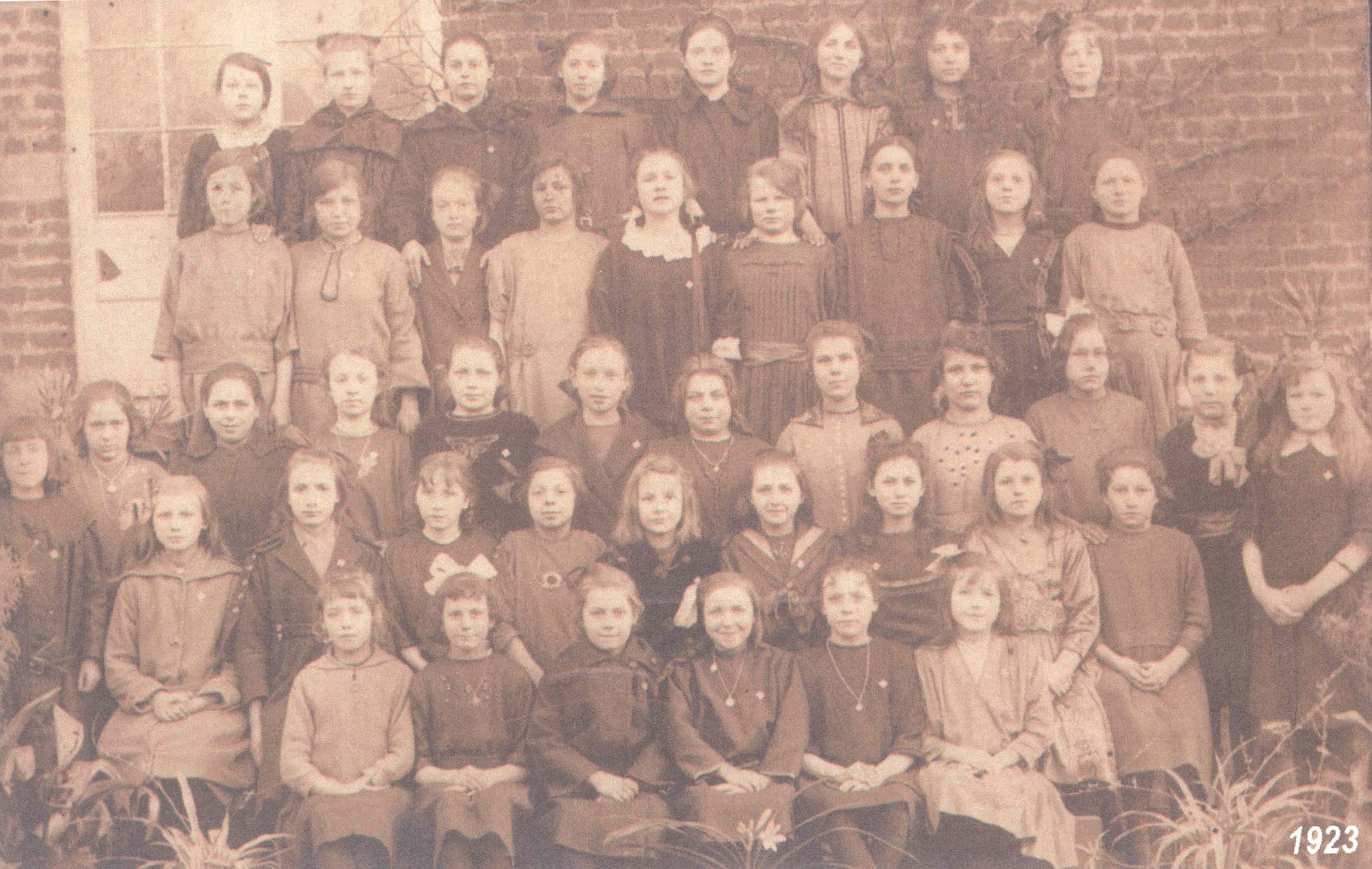 - BeschrijvingKlasfoto 1923, St-Jorisschool, van links naar rechts: eerste rij: 5de Verreck Bertha, tweede rij: 4de Crabbé Maria, 5de Van Humbeek, 9de Van den Bosch Ivonne, derde rij: 4de Van Cauwenbergh Maria, 7de Gooris Maria, 8de Clynen Celine, 9de Laermans Irma, 10de Van Cauwenberg Bertha, 11de Brams Leontine, vierde rij: 5de Andries Emma, 7de De Ruyter Theresia, 8ste Cristael Blondine