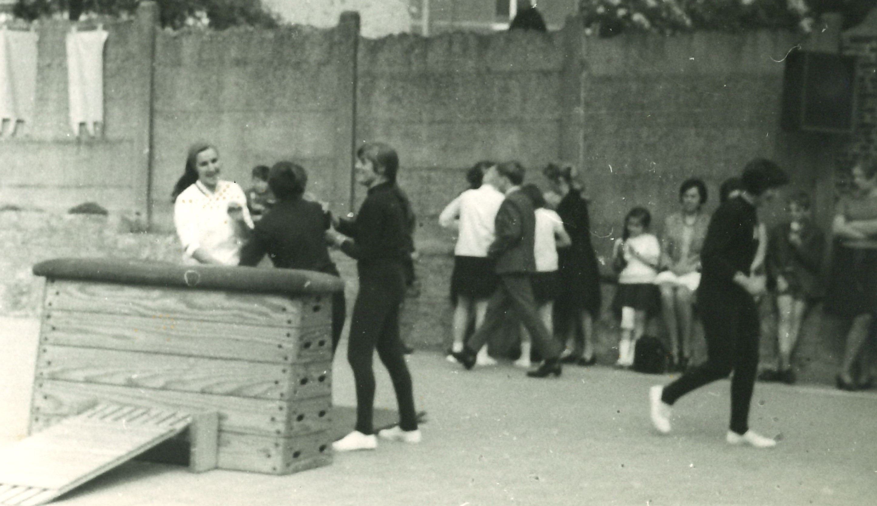 - BeschrijvingGroepsfoto 1968 schoolfeest toestelturnen