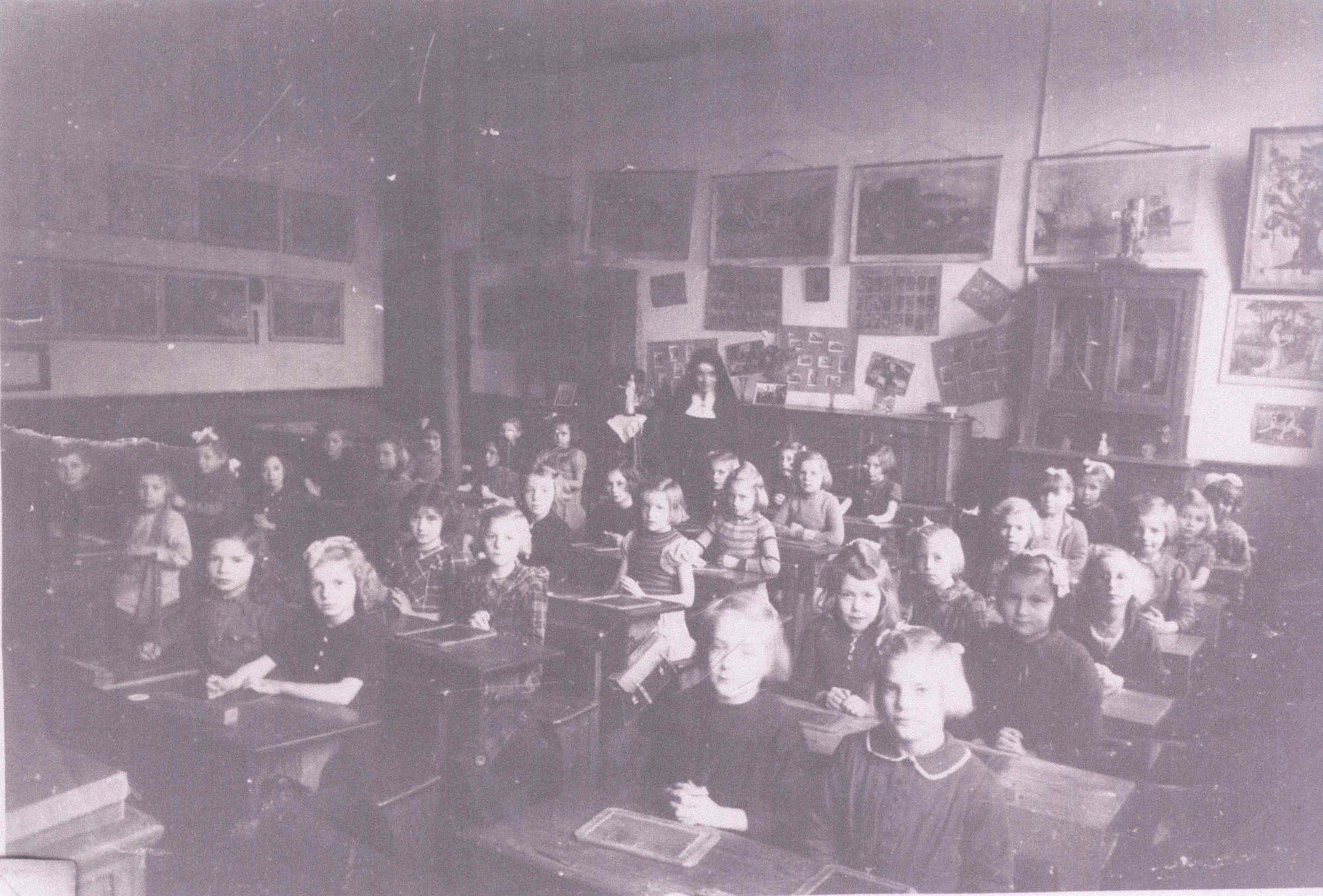 - BeschrijvingKlasfoto 1944-1945, St.-Jorisschool, klasfoto 5de en 6de leerjaar, rij banken rechts op foto: Wolfs Romaine en Tijtgat Maria, Verreck Elza en Bertha Frooninckx, Cleynen Ivonne en Clonen Maria, Bollaerts Paula en Cristael Hilda, Van de Plas Ivonne en Christael Marguerite, rij banken in het midden: Wolfs Paula en Reynders Renilda, Vanderstappen Augusta en Verreck Lea, Bollaerts Cecile en Heeren Ivonne, Van Schoeland Julia en Hoeterickx Ivonne, Van Malcot Godelieve en Puttevils Lizette, rij banken links in het donker: Wolfs Louisa en ? , Verhoeven Jeanne en ? , Liboton Paula en ? , De Houwer Augusta en ?, ?