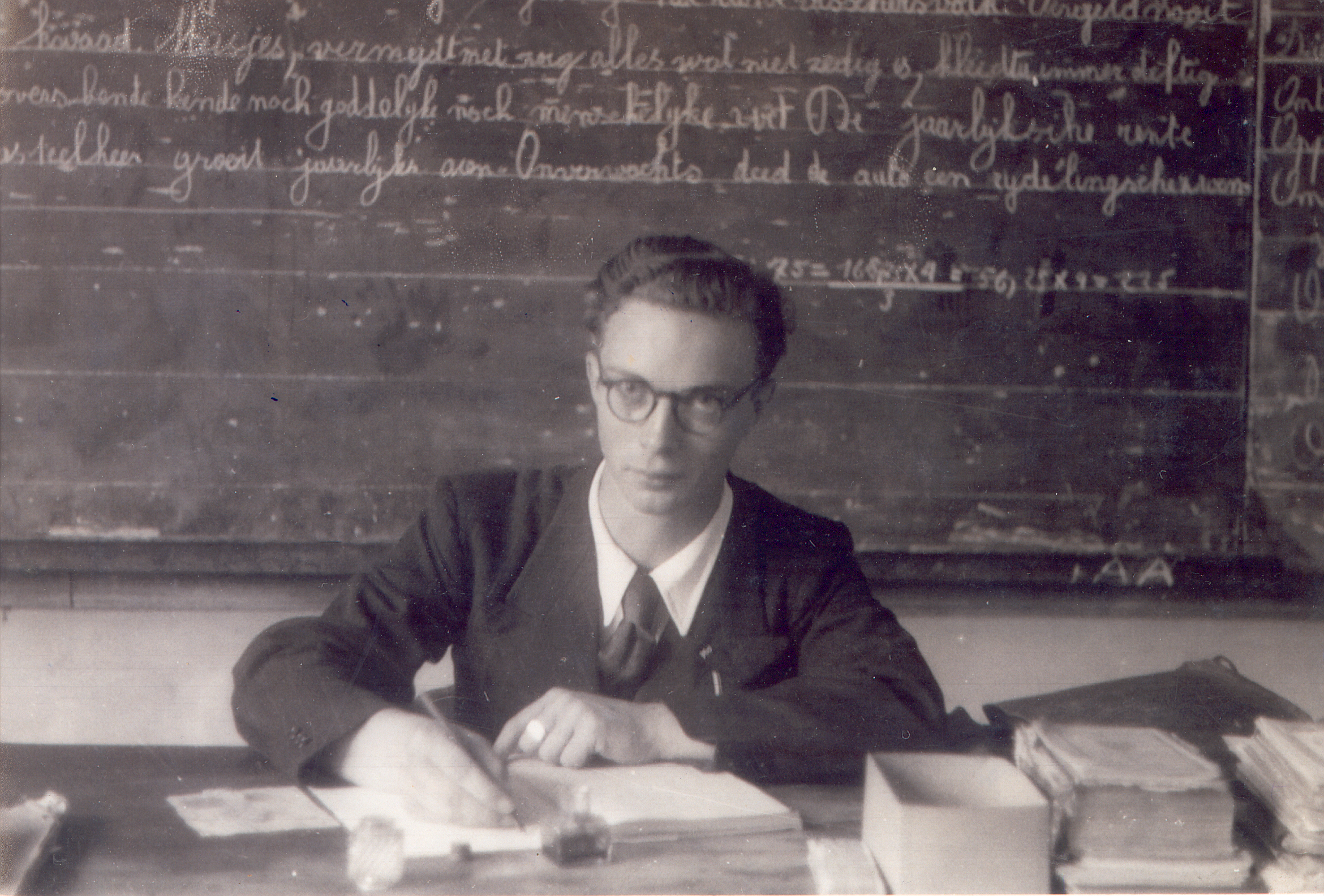 - BeschrijvingMeester Gustaaf Bollaerts (1945) in de Gemeentelijke Jongensschool te St.-Joris-Winge