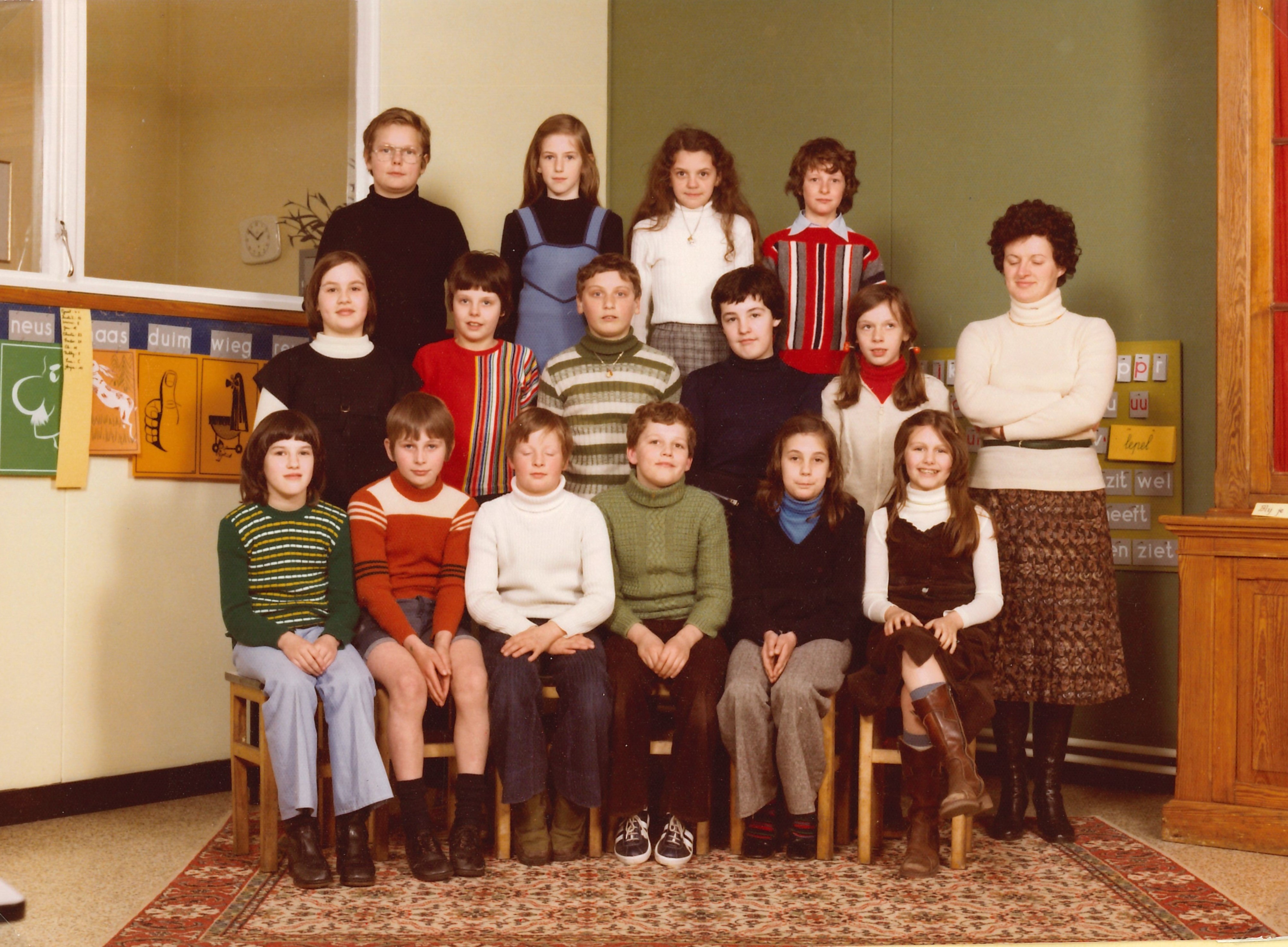 - Beschrijving1977-78 Berg 5e leerjaar 2e rij staand vlnr: x, Greet Tambeur, Chris Berings, Hilde Coosemans, Lut Tambeur, juf Rita François