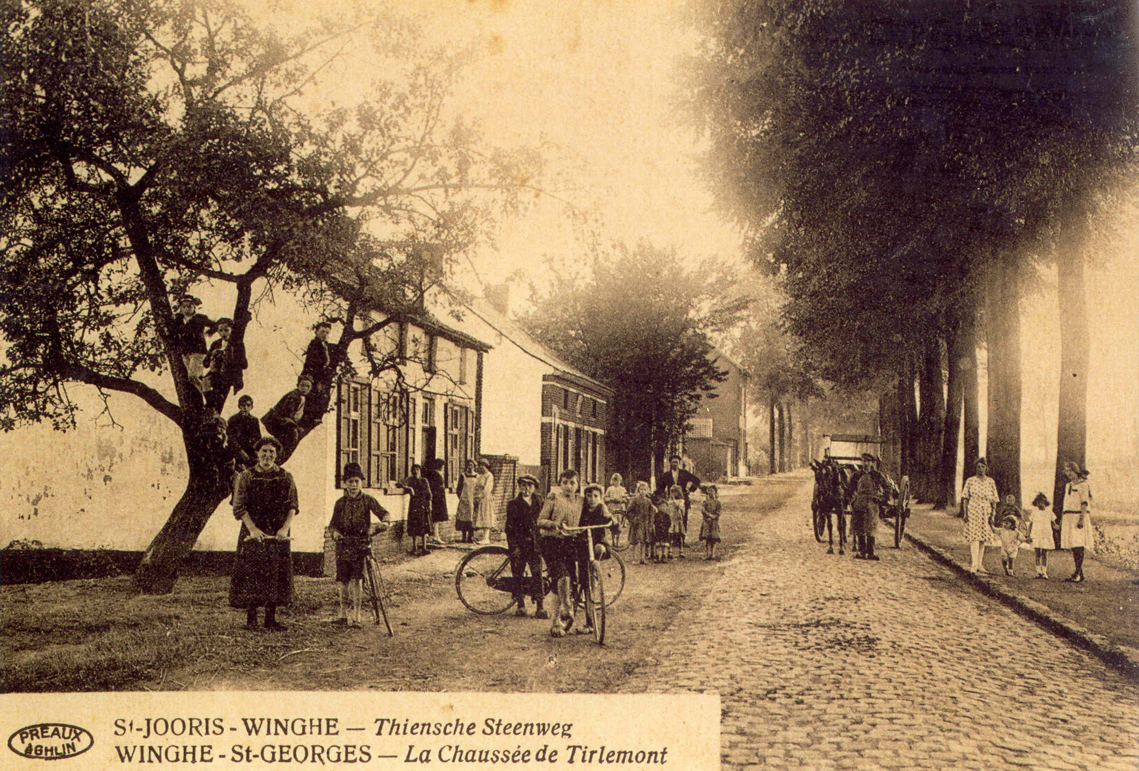 - BeschrijvingDe Tiensche Steenweg te St.-joris-Winge, laatste huis links was het schoolhuis van de bewaarschool, het schoolhuis was eigendom van de gemeente. De bewaarschool werd geleid door de zusters der voorzienigheid