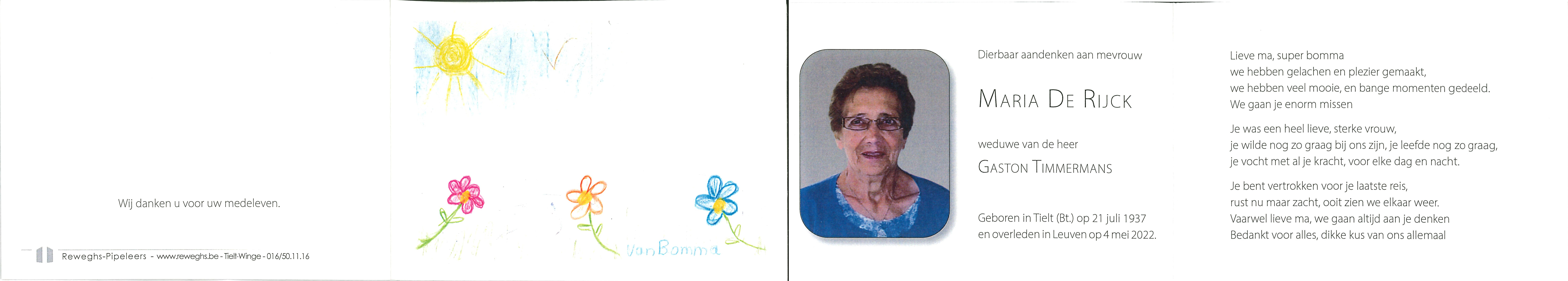 - Beschrijvingdoodsprentje Maria De Rijck °Tielt, 21/7/1937 en +Leuven, 4/5/2022, wwe van Gaston Timmermans.