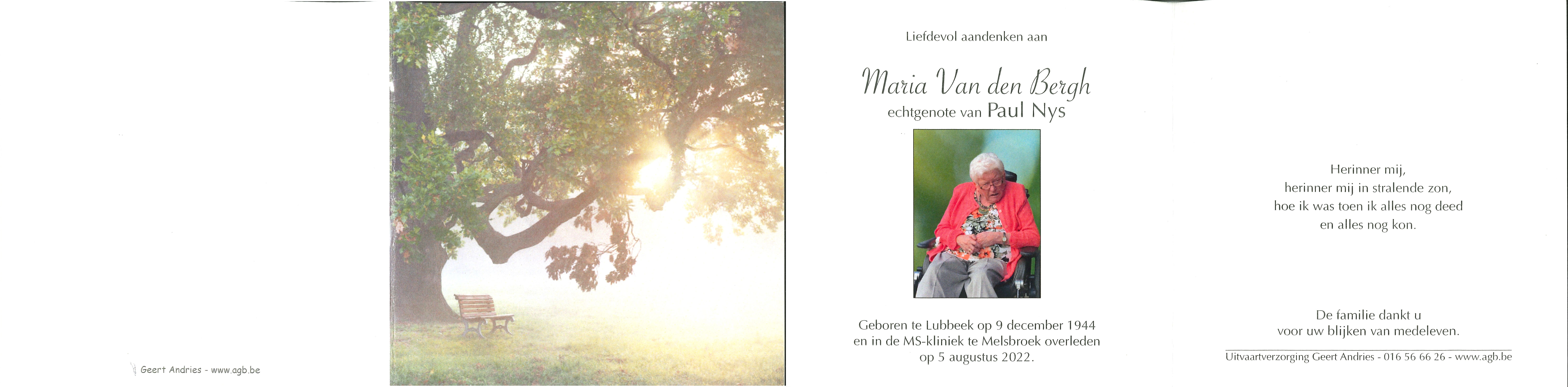 - Beschrijvingdoodsprentje Maria Van den Bergh °Lubbeek, 9/12/1944 en +MS-kliniek Melsbroek, 5/8/2022, echtgenote van Paul Nys