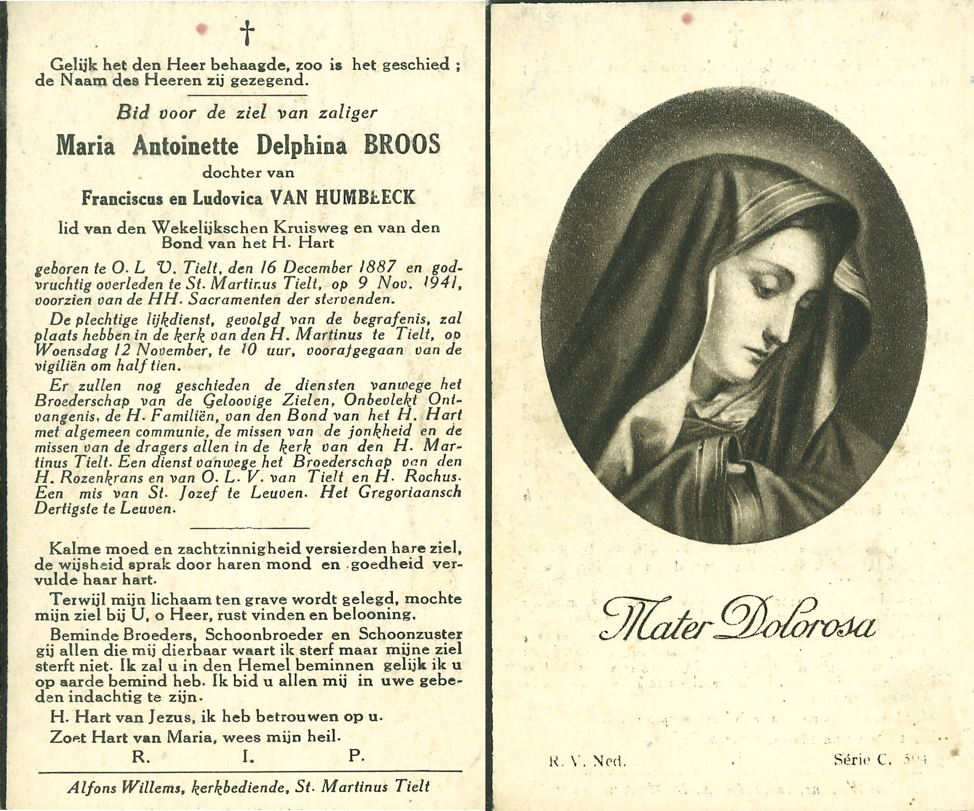 - Beschrijvingdoodsprentje Maria Antoinette Broos, dochter van Franciscus Broos en Ludovica Van Humbeeck, °OLV Tielt, 16/12/1887 en +St. Martinus, 9/11/1941.
