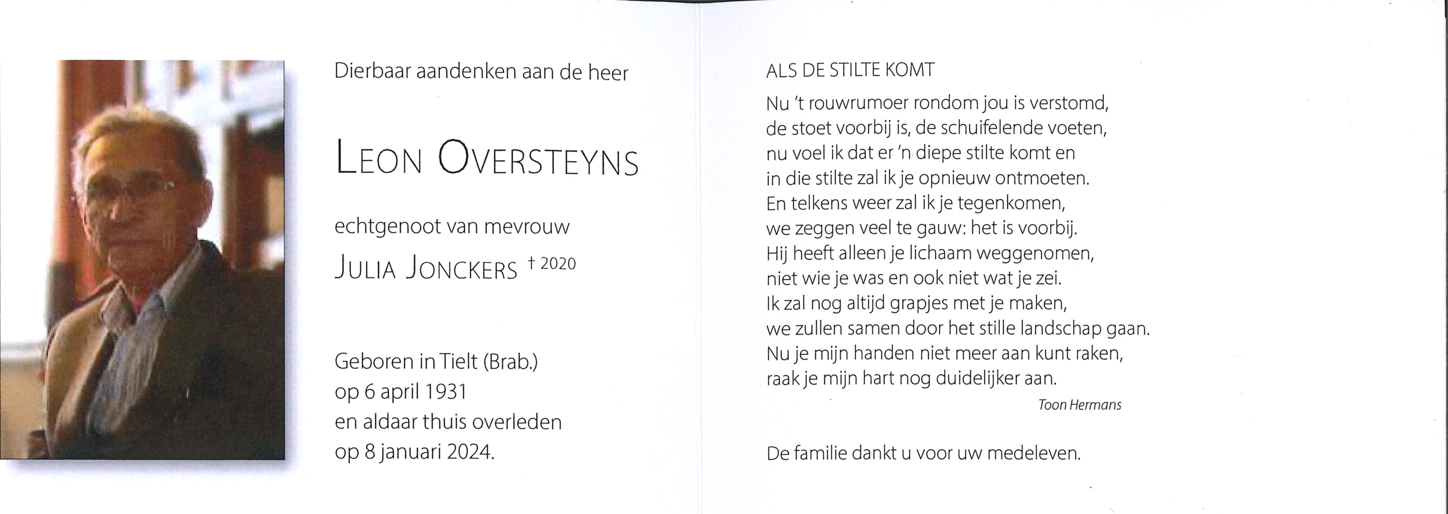 - Beschrijvingdoodsprentje Leon Oversteyns echtgenoot van Julia Jonckers (+2020), °Tielt Brabant, 6/4/1931 en thuis +8/1/2024, oud ondersecretaris gemeente Tielt-Winge