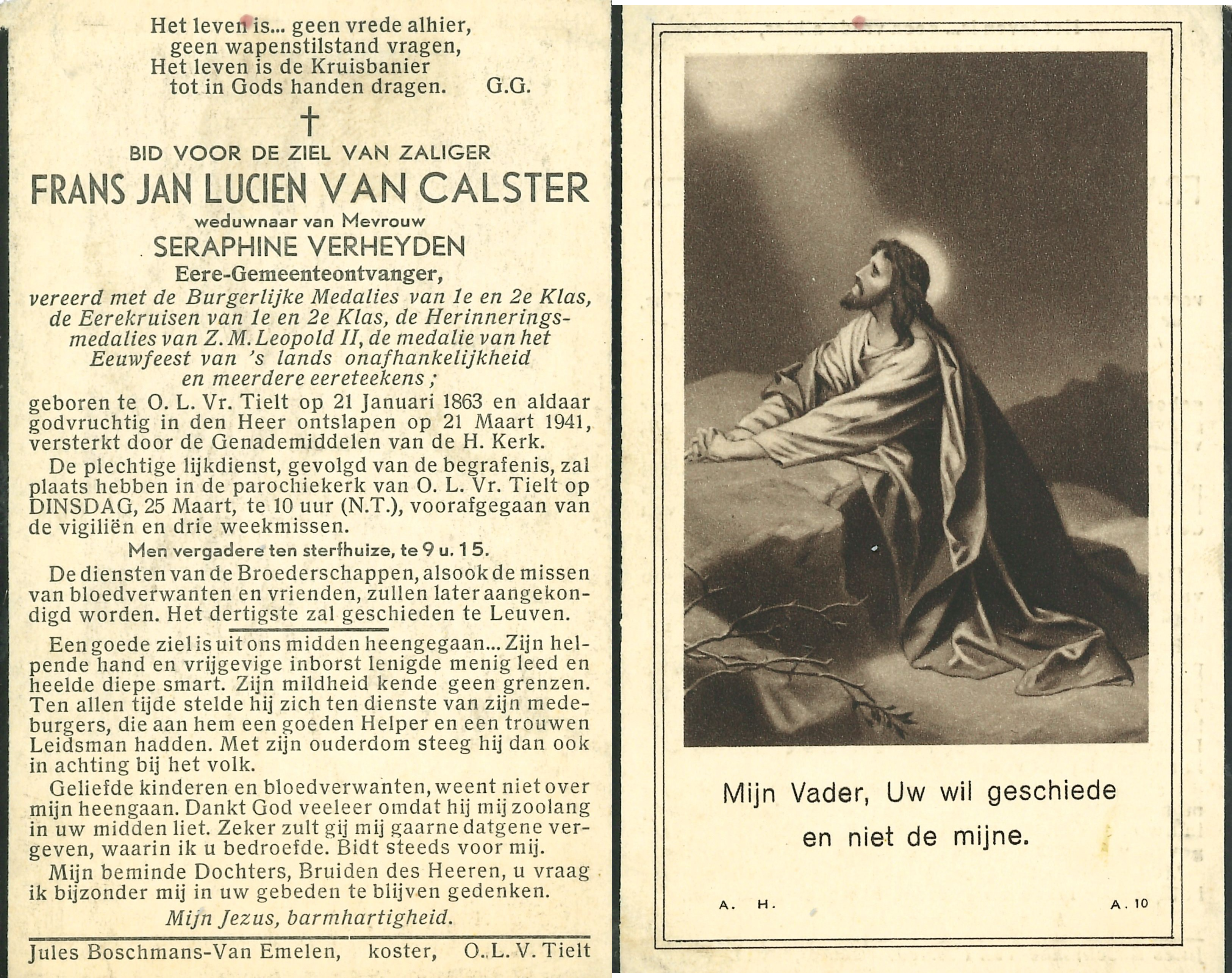 - Beschrijvingdoodsprentje Frans Jan Lucien Van Calster, weduwnaar van Seraphine Verheyden, ere-gemeente ontvanger, °OLV Tielt, 21/1/1863 en +21/3/1941