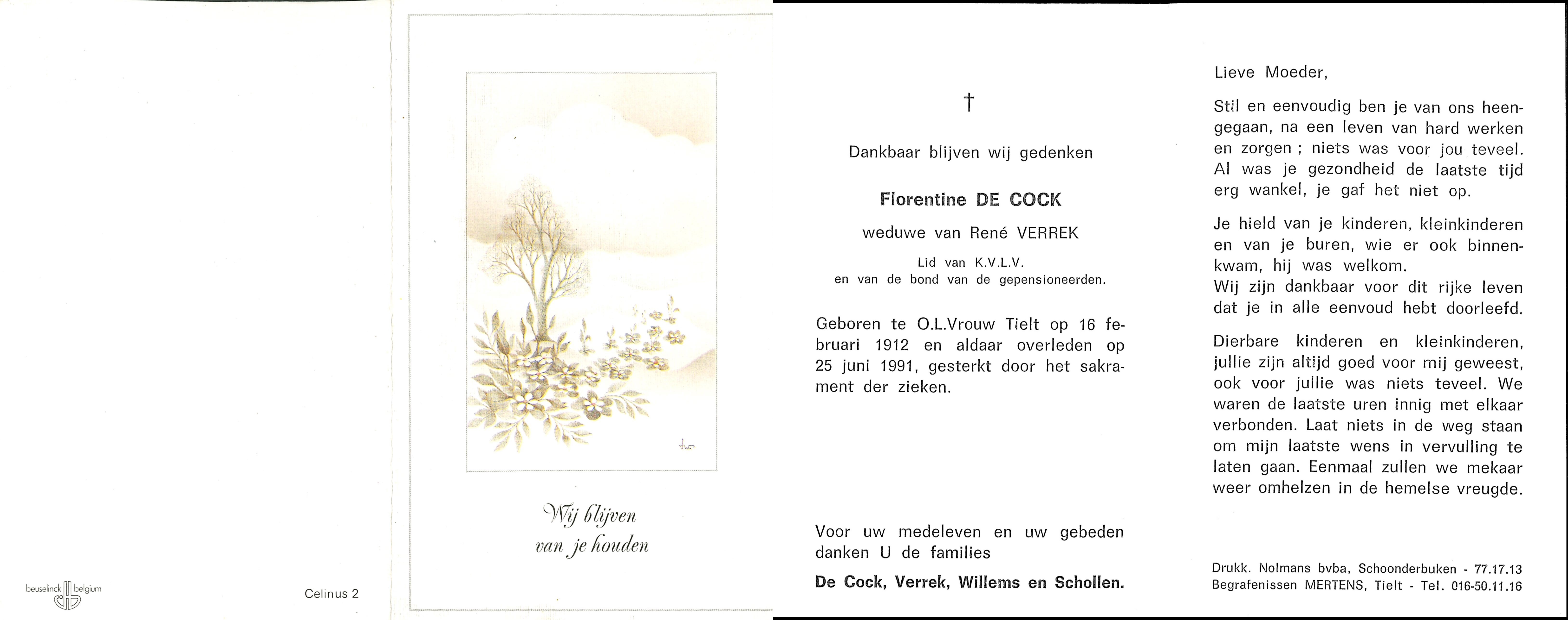 - Beschrijvingdoodsprentje Florentine De Cock °OLV Tielt 16/2/1912 en er + 25/6/1991, echtgenote van René Verrek
