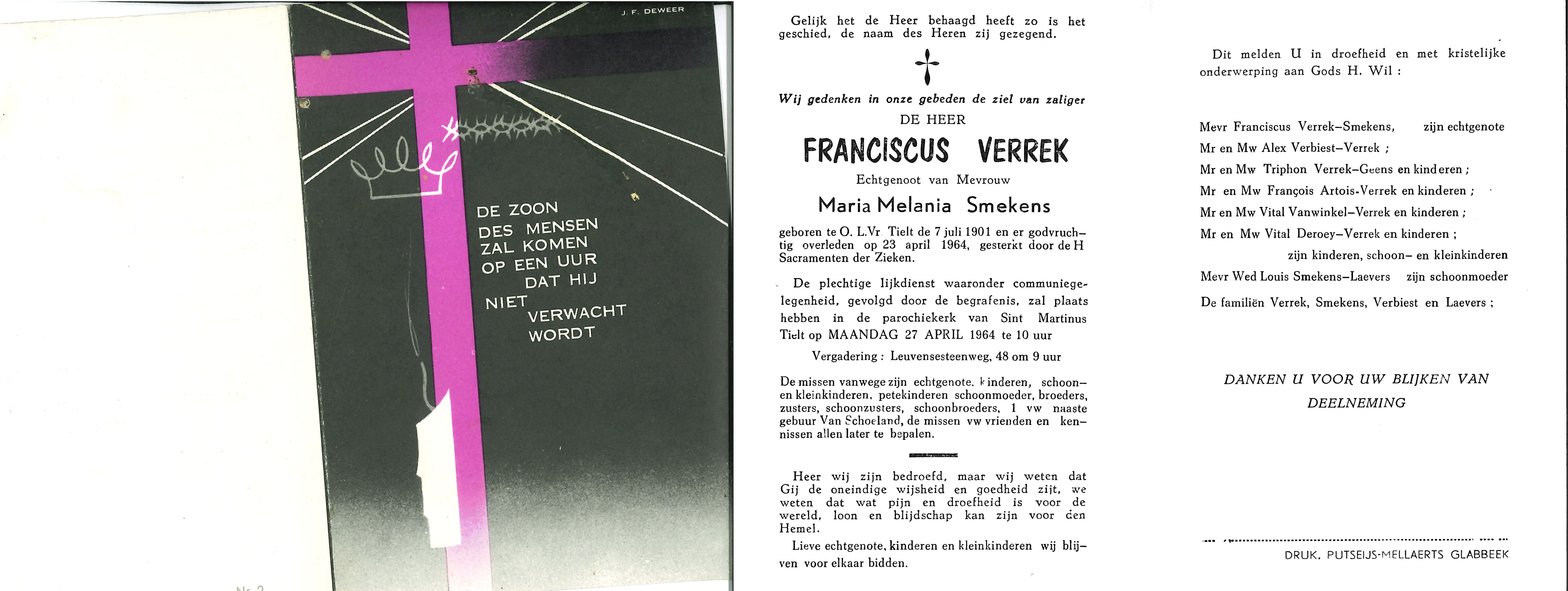 - Beschrijvingdoodsprentje Franciscus Verrek, °OLV Tielt, 07/07/1901 en er + 23/04/1964, echtgenoot van Maria Smekens
