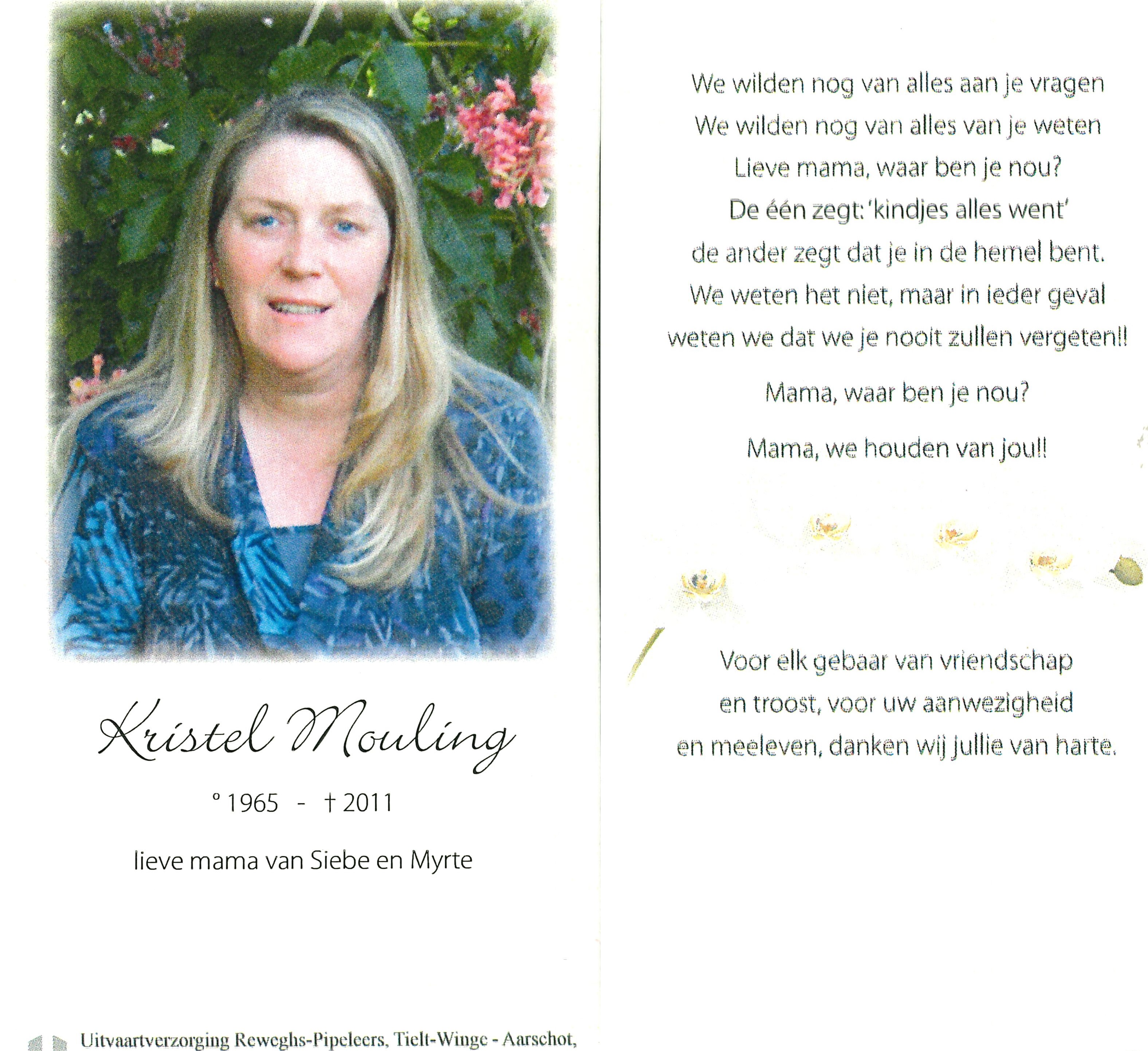 - Beschrijvingdoodsprentje Kristel Mouling, °1965 en + 2011